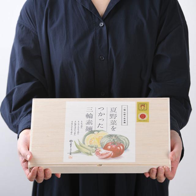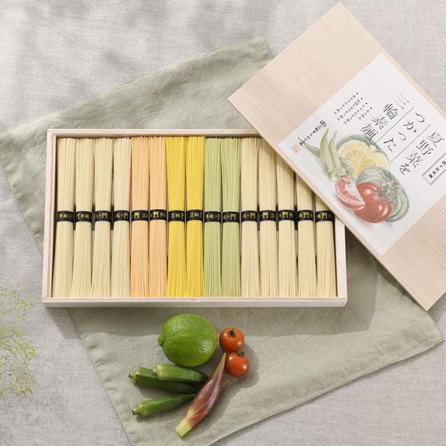 お中元におすすめ。食卓を華やかに彩る、夏野菜の代表トマト・かぼちゃ・オクラをつかった三輪素麺の詰め合わせ。