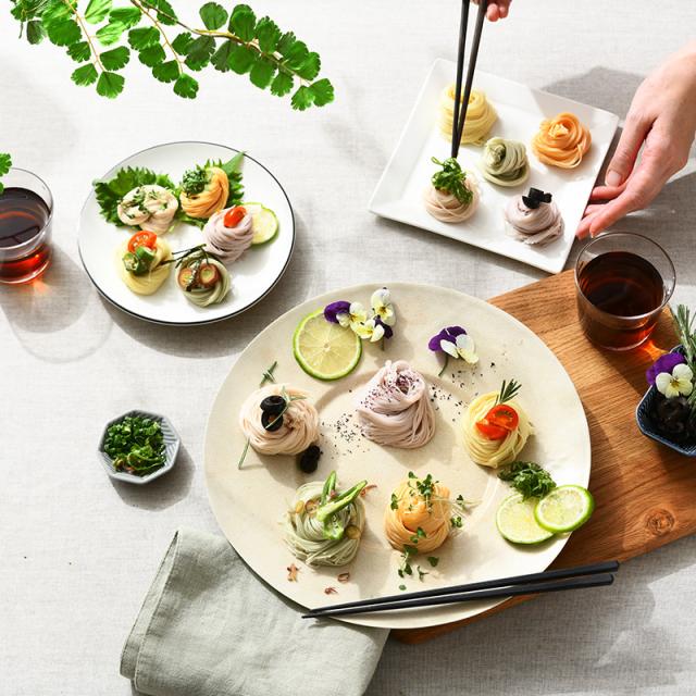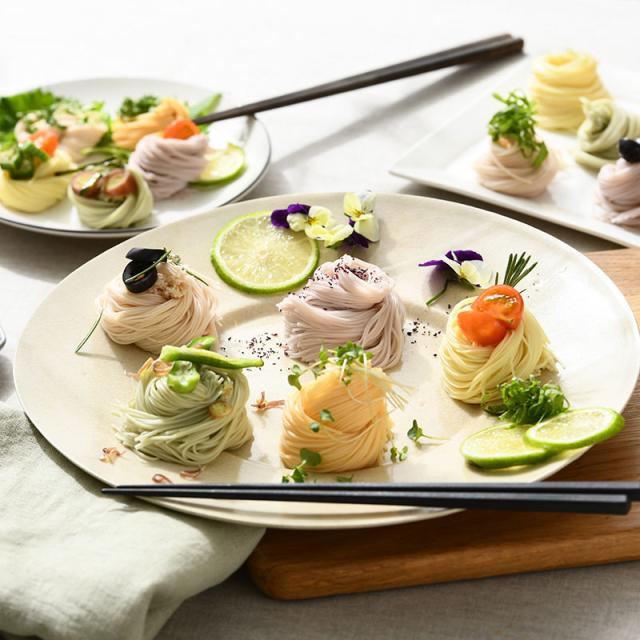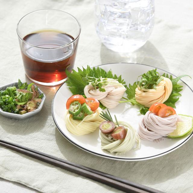 親しみのある夏野菜の代表、トマト・かぼちゃ・オクラそれぞれの野菜の色素を練り込んだ素麺。冷やし素麺やサラダ素麺はもちろん、にゅうめんにしてもおいしくお召し上がりいただけます。お好みの調理方法で華やかな夏をお楽しみください。