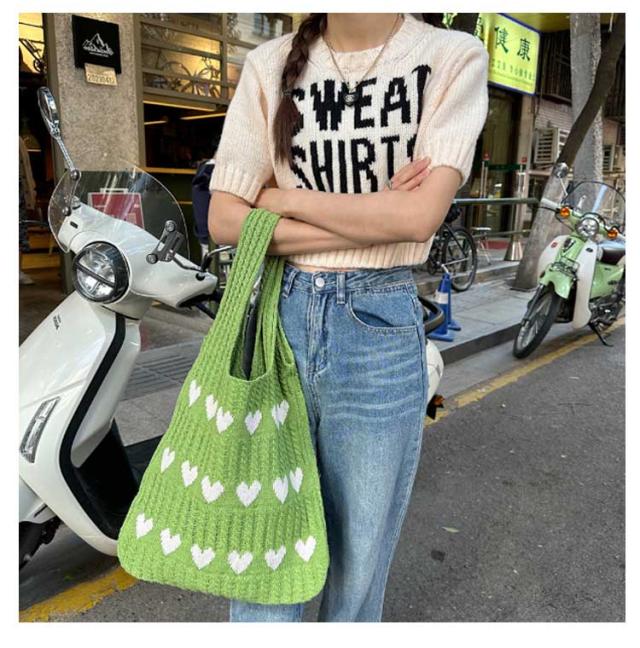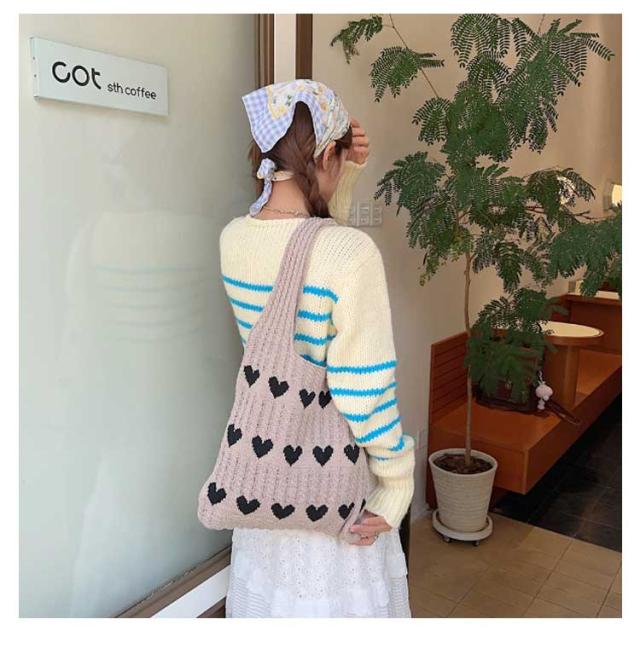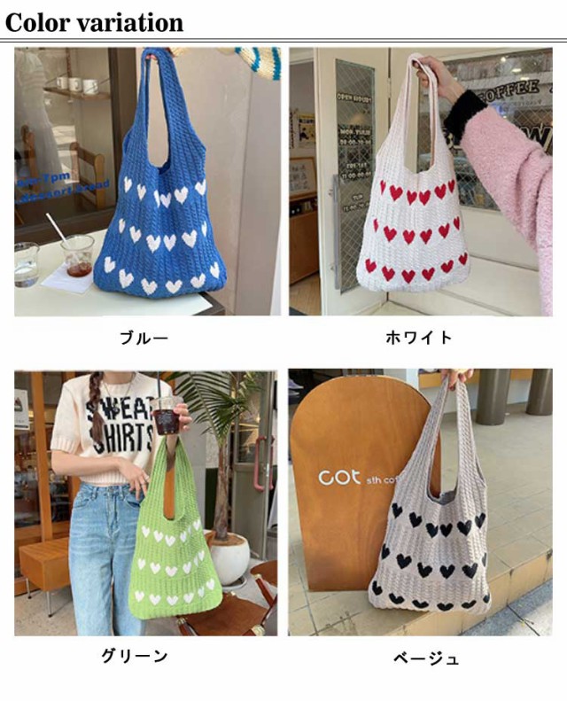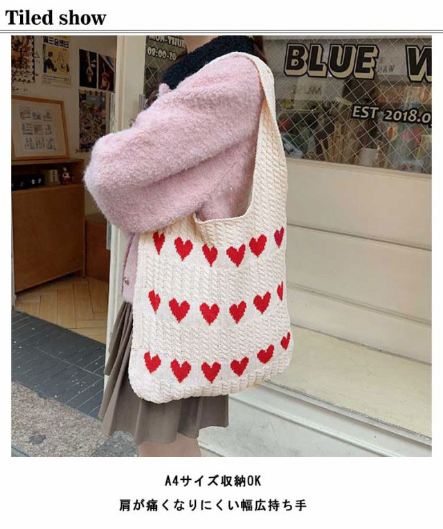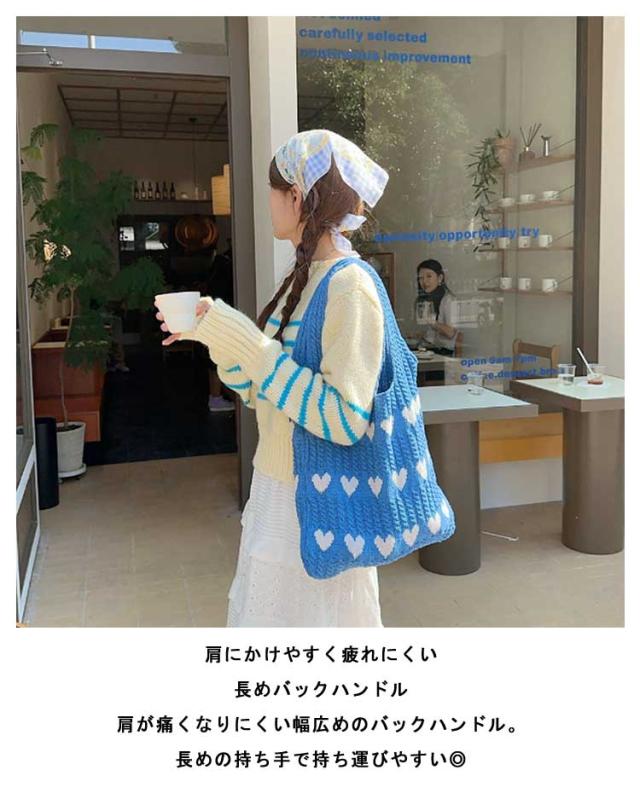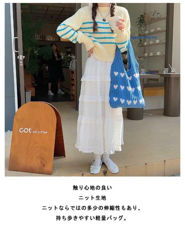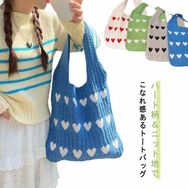 ニットバッグ トートバッグ レディース ハート トート ニットトート エコバッグ ハート柄 ニット生地 A4サイズ 収納可能 かばん 鞄 軽量 肩掛けカバン 通勤 通学 日常 ディリー 普段使い 通学 買い物 シンプル カジュアル ナチュラル おしゃれ