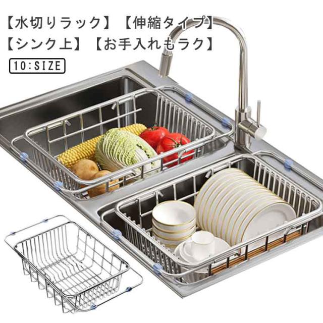 | 【水切りラック】【伸縮タイプ】【シンク上】【お手入れもラク】 これ一台で洗い物をスッキリ収納できる水切りバスケット。 高さ13cmの深いタイプなので、ボウル、深さのある器も入れやすいサイズです。 丈夫なステンレスを使用し、たくさんのお皿や重さのある鍋を入れても型崩れしにくく、安心して使えます。 スライド式の伸縮でシンクの大きさに合わせられるので、限られたスペースに設置可能。 シンクの内側にセットすれば、キッチンの作業台を広く使える。 ステンレスなら、水に強く、強度も耐久性も抜群、カビにくくヌメリの心配も少ないのが特徴です。 両サイドには、シンク上を傷付けないようゴム足付き、滑り止め機能もある。 シンク内に設置し、洗った食材の一時置き、料理の作業スペース、食器の水切りに最適。 | |