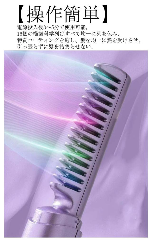 | 【良質な材質】PTC材料を用いて製造し、耐久性があり、変形せず、歯が抜けない、断熱櫛歯+断熱ハウジング、二重保障。3段階の温度調節があり、リンスセラミックコーティングが含まれており、使用中に髪質を傷つけることはありません。 【大容量&便利なUSB充電】大容量バッテリーを搭載しており、大で70分間使用可能です。また、USB充電に対応しており、充電が簡単で便利です。さらに海外対応なので、旅行先でも安心して使用できます。 【コードレス&持ち運びやすい】ポータブル縮毛矯正ブラシはコードレスで使いやすいです。縮毛矯正やカールの際にワイヤーが絡む心配がありません。本体はシンプルですっきりとしており、持ち運びも簡単ですワイヤレスヘアアイロンは素早く充電でき、便利に使用できます。 【マイナスイオン技術】このマイナスイオンヘアアイロンは高度なヘアアイロン技術を採用し、効率的な充電システムを搭載しており、いつでもどこでも簡単に使用できます。 自宅だけでなく、旅行などにも適しており、いつでも完璧なヘアスタイルを維持できます。 【操作簡単】電源投入後3〜5分で使用可能。16個の櫛歯科学列はすべて均一に列を包み、特質コーティングを施し、髪を均一に熱を受けさせ、引っ張らずに髪を詰まらせない。 | |