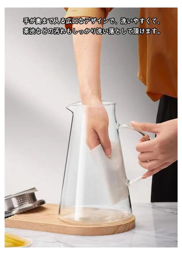 | 【ガラスポット】【直火対応】【洗いやすい】【冷蔵庫ポット】 手が奥まで入る広口なデザインで、洗いやすくて、茶渋などの汚れもしっかり洗い落として頂けます。 ステンレスで作った蓋に茶こしが二種類ついて、使い便利です。 大人でも四本の指が入るほどの大きめのハンドルだから、持ちやすく、注ぐ量もコントロールしやすい。 耐熱ガラスなので、電気陶炉、ガスコンロともご使用可能です。 ガラスポットは透明感が良くて、残りの水量も一目瞭然、わかりやすいです。 暑い季節には麦茶やアイスティーを煮出して冷やし、そのままテーブルに出しても素敵です。 | |