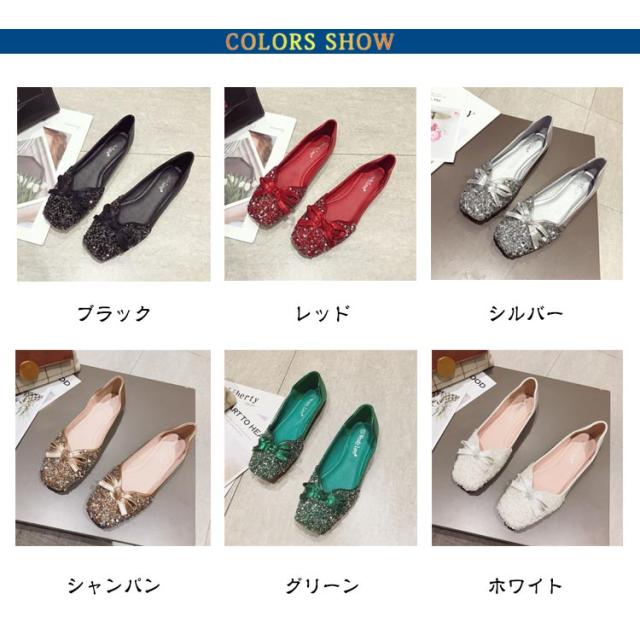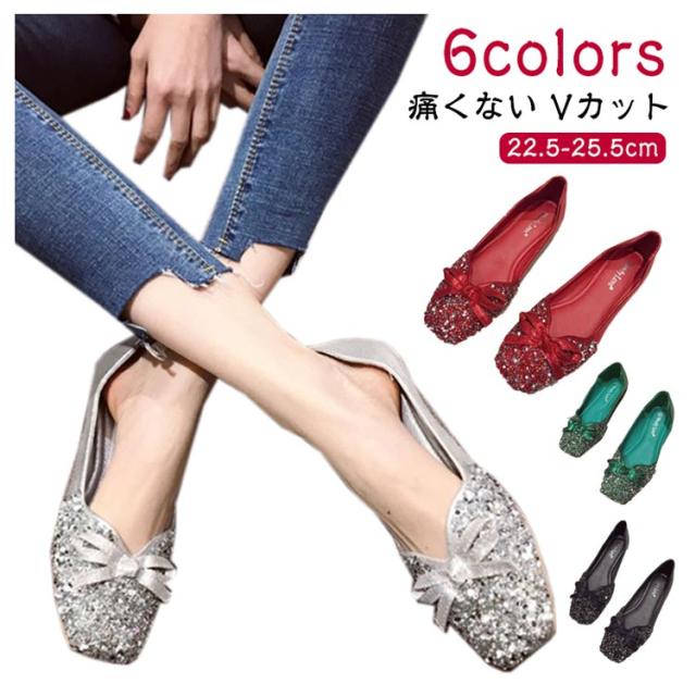 パンプス キラキラ ぺたんこパンプス ローヒール 痛くない Vカット バレエシューズ レディース シューズ 靴 結婚式 オフィス スクエアトゥ 走れるパンプス フラットシューズ 柔らか リボン 韓国ファッション 歩きやすい 楽ちん 疲れない