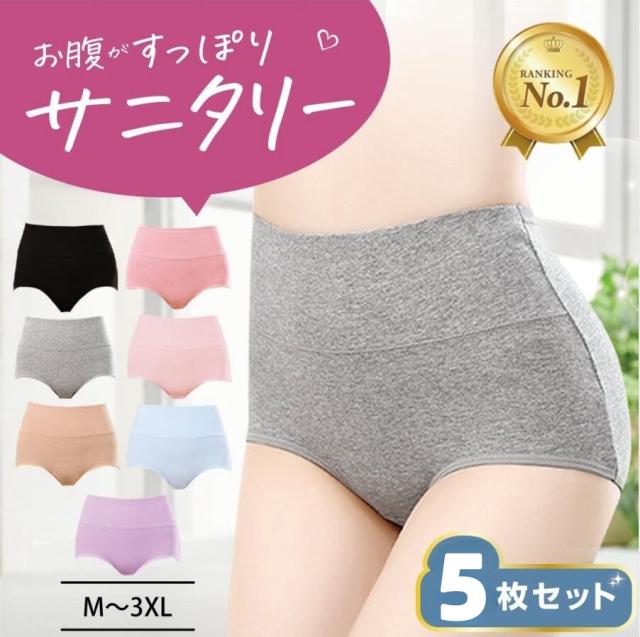 [5枚セット]ハイウエスト サニタリー ショーツ レディース パンツ インナー 無地 女性 下着 深め 深履き 綿 おしゃれ