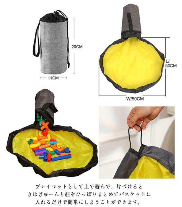 | 【2WAYの収納バスケット】おもちゃが散らばらないように遊べる! プレイマット仕様にもなる! 2WAYの便利なおもちゃ収納バスケットです。プレイマットとして上で遊んで、片づけるときはぎゅーんと紐をひっぱりまとめてバスケットに入れるだけで簡単にしまうことができます。 【おもちゃの紛失を防ぎ片付け簡単】広げるとシートのようになっている収納袋。この上で遊べて、遊び終わったあと紐をキュッと絞めるだけでお片付け完了! おもちゃ箱にしまうよりとても簡単です。特に小さいパーツを繋げて遊ぶようなおもちゃや、ブロック等の細かいおもちゃの片付けがスムーズにできるのでとっても快適です。また、おもちゃの紛失を減らせます。 【防水素材】丈夫な防水素材を採用しているので、擦れや破れに強く、汚れても水で洗うことが可能です。 【シンプルな見た目ですっきり収納】おもちゃ片付け箱として、おもちゃをしまったらそのままお部屋に置いておくことができます。 シンプルなバスケット型なので、どんなお部屋にも馴染みます。 簡単にまとめてコンパクトになるので、移動にも便利! | |