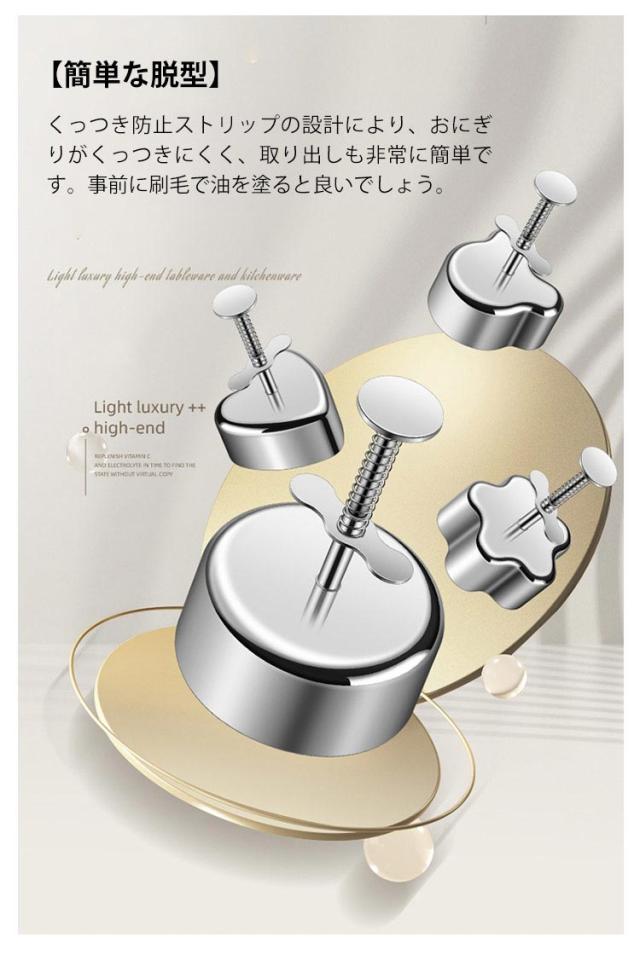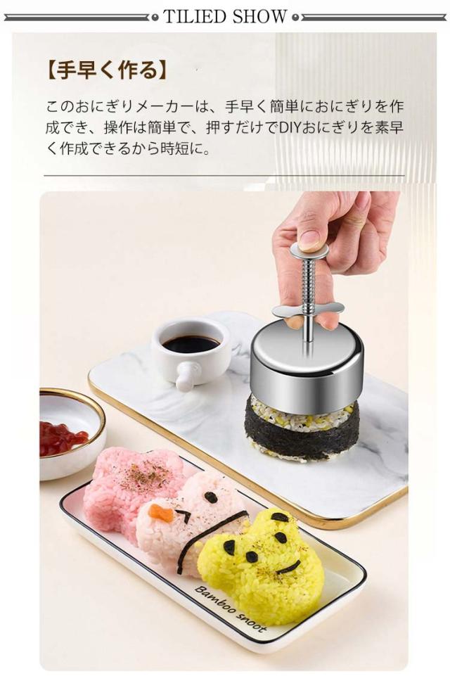 | 衛生で耐久性抜群のステンレス製おにぎり押し型。 【手早く作る】: このおにぎりメーカーは、手早く簡単におにぎりを作成でき、操作は簡単で、押すだけでDIYおにぎりを素早く作成できるから時短に。 【簡単な脱型】:くっつき防止ストリップの設計により、おにぎりがくっつきにくく、取り出しも非常に簡単です。事前に刷毛で油を塗ると良いでしょう。 【清掃が簡単】:金型の構造はシンプルで、デッドスペースがなく、清掃が容易です。手洗いや機械による洗浄が可能です。 | |