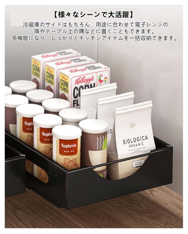 | 使いやすい引き出し式水切りラック 【使用便利】引き出し付きで、奥の物もすぐに取り出せます。 【取付簡単&省スペース】隙間があれば設置可能で、空間を有効活用できます。 【シート付き&滑らかな加工】 小物を入れても落ちないよう、底部にポリプロピレン製のシートが付いています。安全性を確保するため、特によく使う取っ手の縁には全体的に滑らかな加工を施し、より安心かつスムーズにご使用いただけます。 【様々なシーンで大活躍】 冷蔵庫のサイドはもちろん、用途に合わせて電子レンジの隣やテーブル上の隅などに置くこともできます。多機能になり、しっかりとキッチンアイテムを一括収納できます。 | |