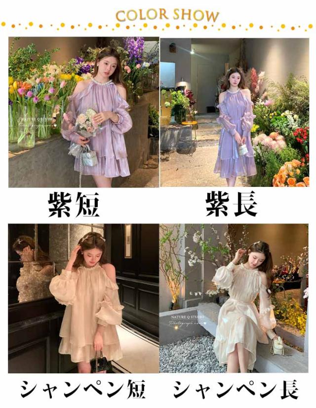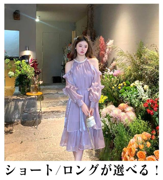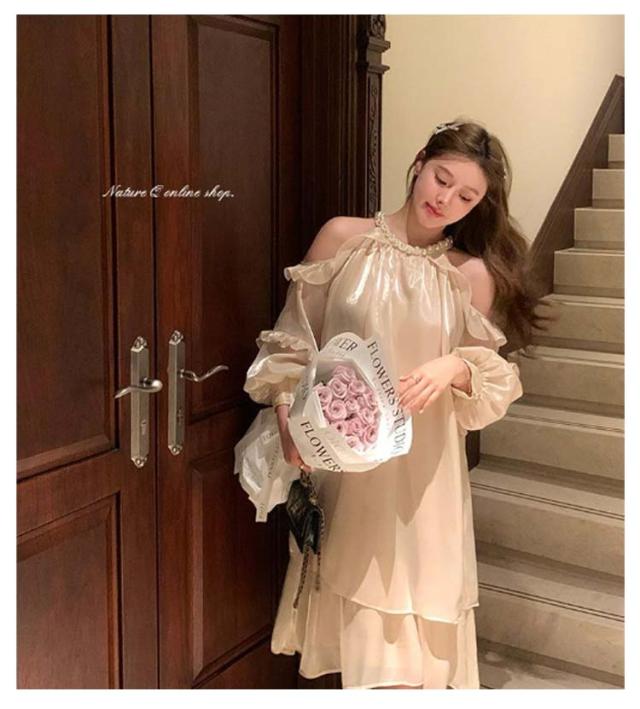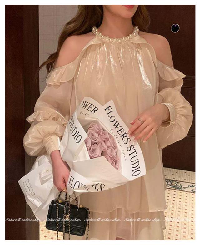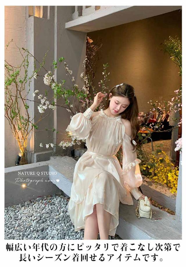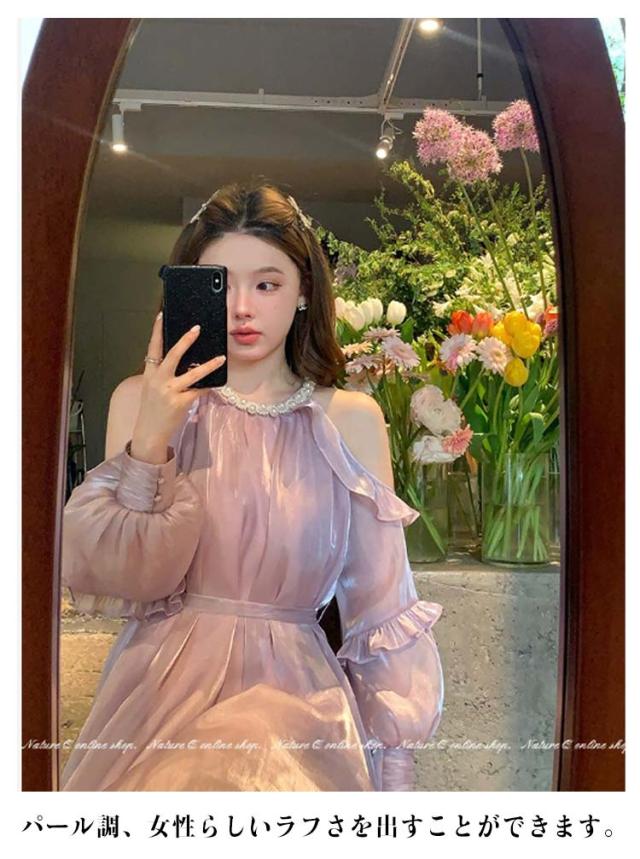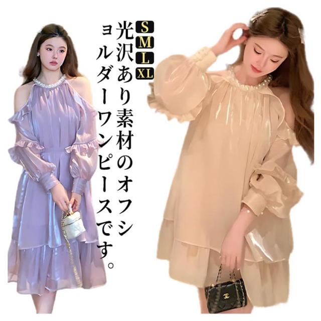光沢 着痩せ オフショルダー バルーン袖 ロングワンピース 30代 ワンピース ショート エレガント 長袖 おしゃれ パール調 20代 光沢 40代 50代 S M L