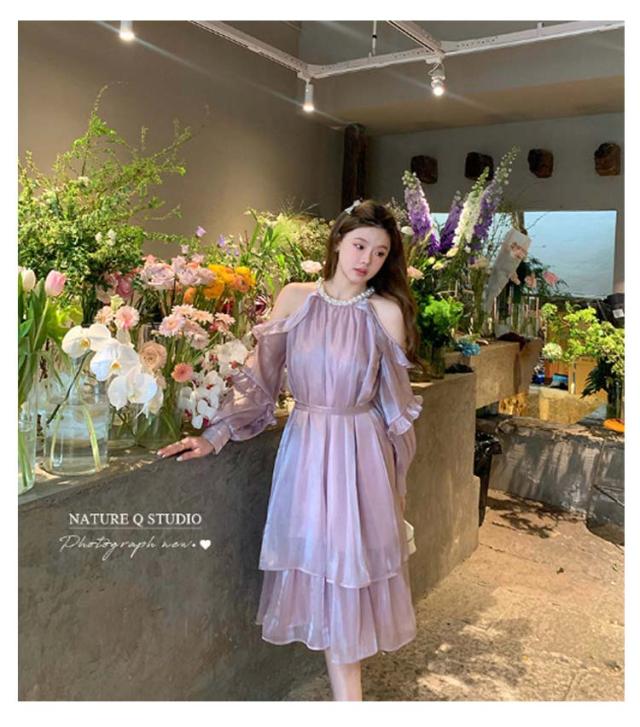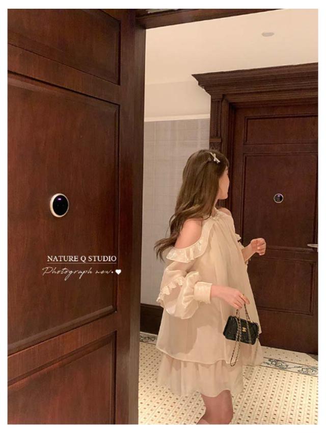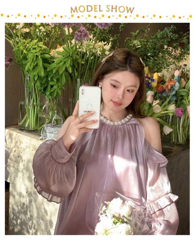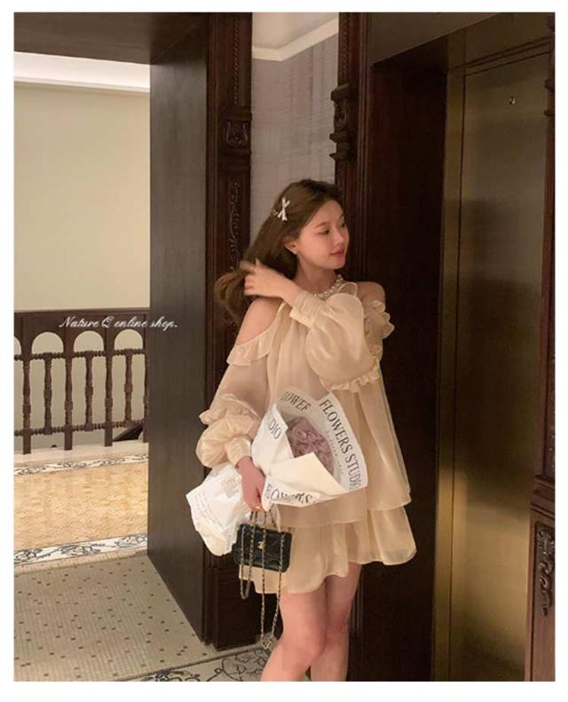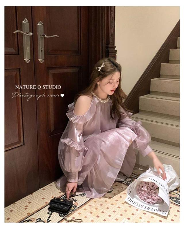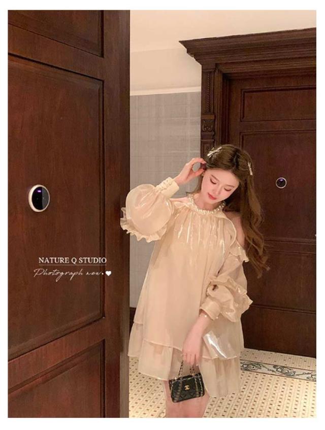 光沢 着痩せ オフショルダー バルーン袖 ロングワンピース 30代 ワンピース ショート エレガント 長袖 おしゃれ パール調 20代 光沢 40代 50代 S M L