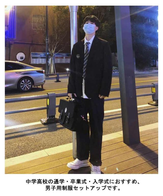 | ジャケット+長袖シャツ+ズボン+ネクタイの4点セット! 中学高校の通学・卒業式・入学式におすすめ、男子用制服セットアップです。 ウォッシャブル、汗やニオイが気になる人にはうれしいデザイン!ご家庭で丸洗いが可能な機能素材を使用しています。 独特シャープなシルエットの男子用制服ブレザーです。3つボタンで、毎日着ていただける特別な仕様となっているため、安心して学校に通っていただけます。 | |