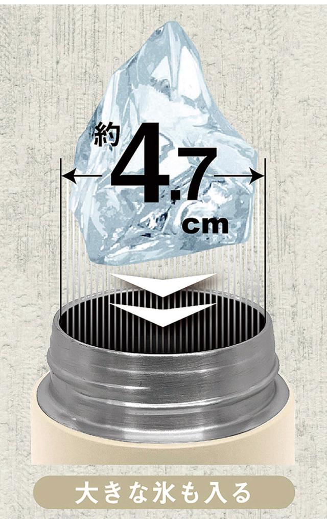 真空構造でおいしい飲み頃長持ち!大きな氷ラクラクも入る大口径。熱い飲み物飛び出し防止、氷が止まる、氷ストッパー付。
