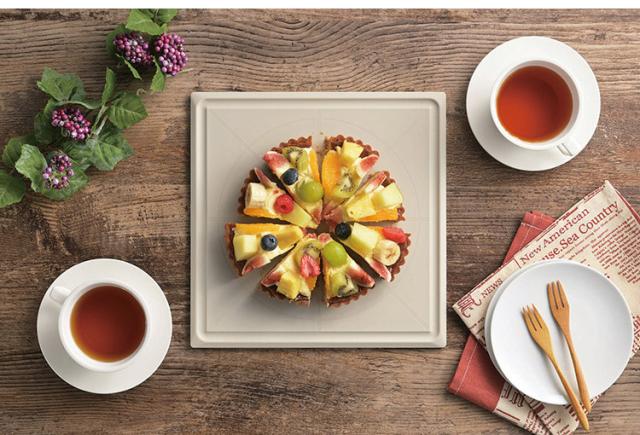 均等にカットできる〇×ライン。均等にカット目盛り付。汁こぼれ防止の溝付き。全周テーパーカットで取りやすい。食卓のお皿としても使用できる正方形形状。安定感がある厚み。