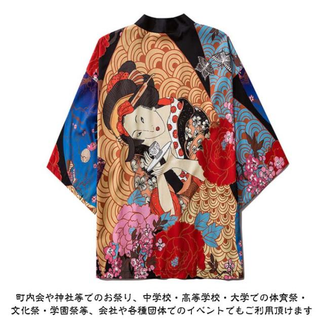 | バックが目を惹く、美しい和柄をプリントしたサマーカーディガン。 古風和柄を入れることで粋を演出し、はっぴを着る楽しみ、遊びごころを大切にしています。 和のモチーフを使いながらも配色やパターンは和装らしからぬ大胆さで新しい法被の形を展開。 女性でも男性でも使用可能なサイズ展開!ちょっと大きめなのでショートパンツ等と合わせて使用可能。 和装の法被をモダンなさっと羽織れるカーディガン風にアレンジしたファッションアイテムです。 町内会や神社等でのお祭り、中学校・高等学校・大学での体育祭・文化祭・学園祭等、会社や各種団体でのイベントでもご利用頂けます | |