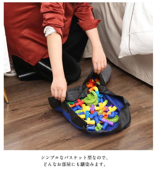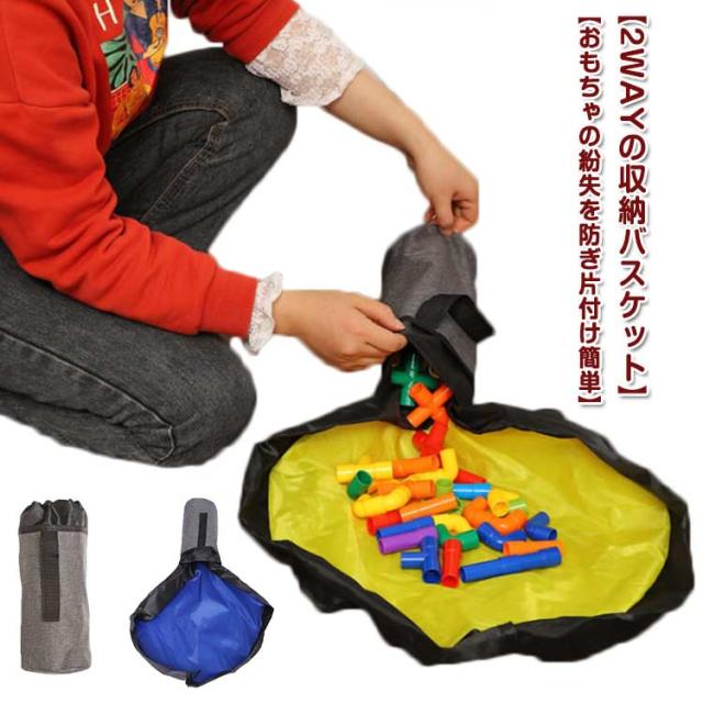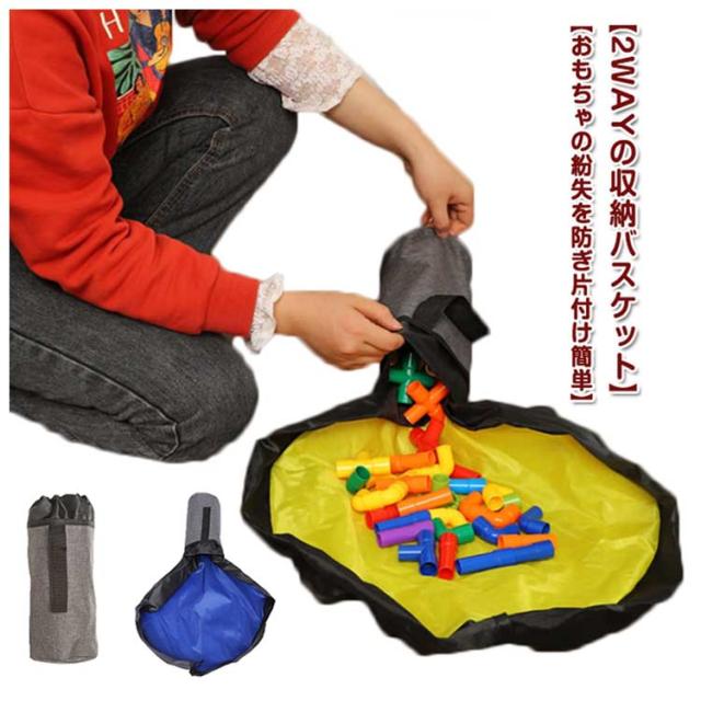| 【2WAYの収納バスケット】おもちゃが散らばらないように遊べる! プレイマット仕様にもなる! 2WAYの便利なおもちゃ収納バスケットです。プレイマットとして上で遊んで、片づけるときはぎゅーんと紐をひっぱりまとめてバスケットに入れるだけで簡単にしまうことができます。 【おもちゃの紛失を防ぎ片付け簡単】広げるとシートのようになっている収納袋。この上で遊べて、遊び終わったあと紐をキュッと絞めるだけでお片付け完了! おもちゃ箱にしまうよりとても簡単です。特に小さいパーツを繋げて遊ぶようなおもちゃや、ブロック等の細かいおもちゃの片付けがスムーズにできるのでとっても快適です。また、おもちゃの紛失を減らせます。 【防水素材】丈夫な防水素材を採用しているので、擦れや破れに強く、汚れても水で洗うことが可能です。 【シンプルな見た目ですっきり収納】おもちゃ片付け箱として、おもちゃをしまったらそのままお部屋に置いておくことができます。 シンプルなバスケット型なので、どんなお部屋にも馴染みます。 簡単にまとめてコンパクトになるので、移動にも便利! | |