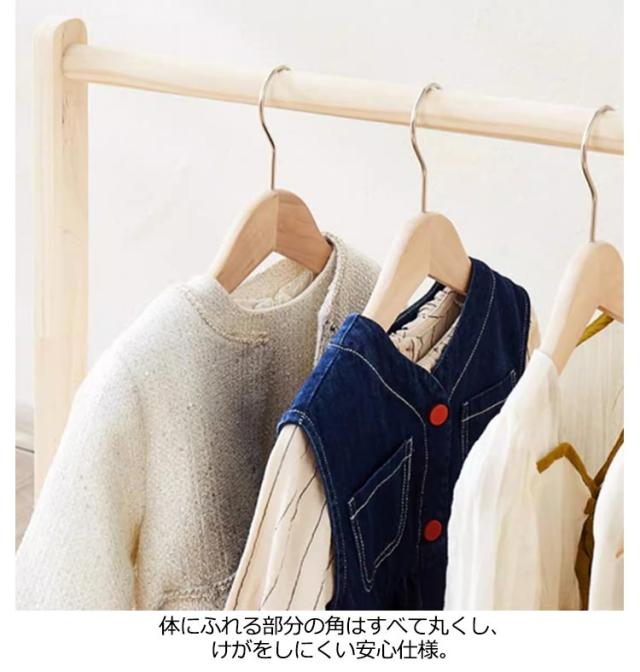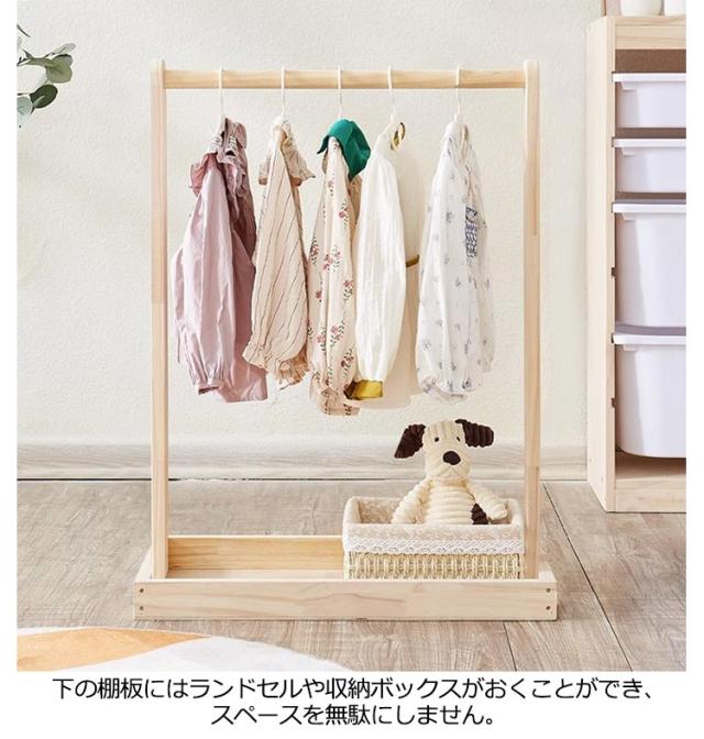 | 子ども用木製ハンガーラック。【2段?棚付き】 園服も普段着の子供服も楽に掛けられる高さです。 下の棚板にはランドセルや収納ボックスがおくことができ、スペースを無駄にしません。 置き場所を選ばないスリム&コンパクト 体にふれる部分の角はすべて丸くし、けがをしにくい安心仕様。 | |