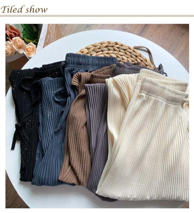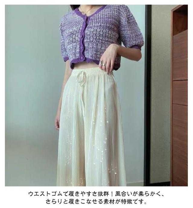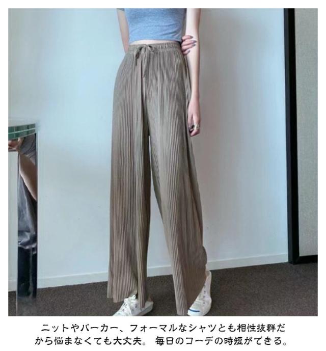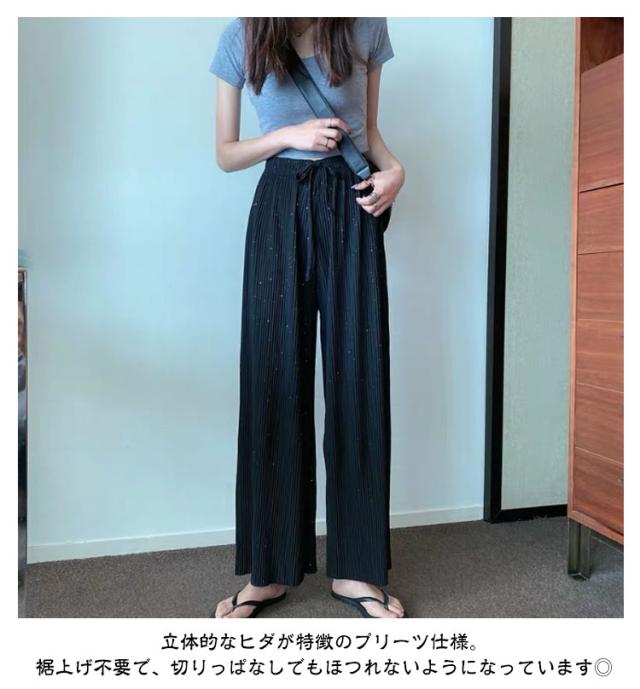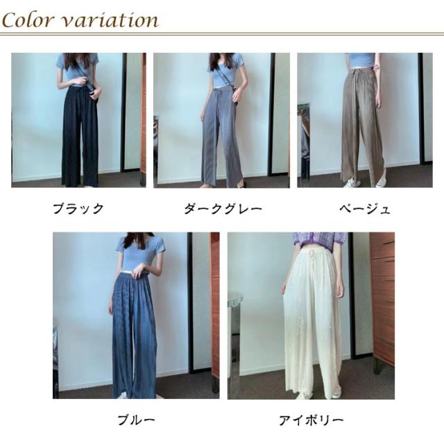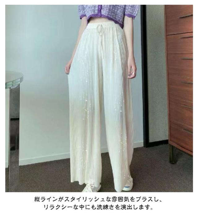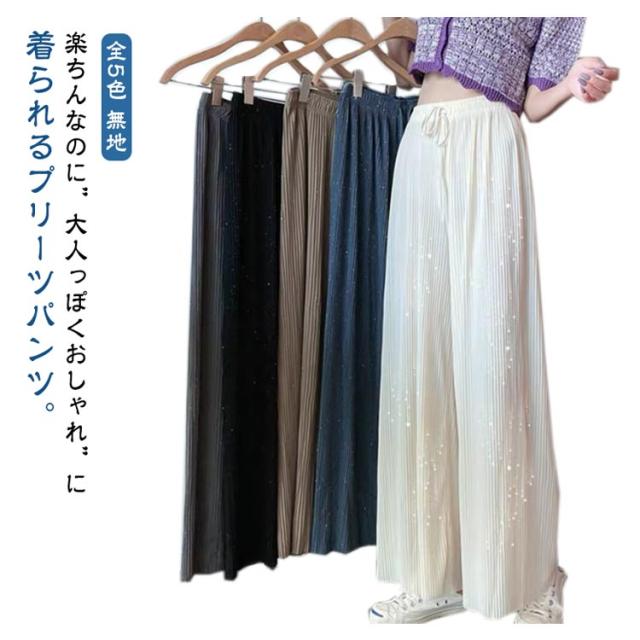 ストレートパンツ フレアパンツ レディース ハイウエスト キラキラ ワイドパンツ カラーパンツ セルフカット キラキラ 着痩せ リラックス 裾カット ロング丈 プリーツパンツ ウエストゴム シンプル 無地 大人カジュアル イージーパンツ