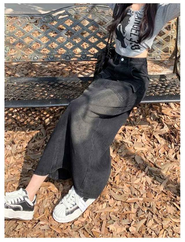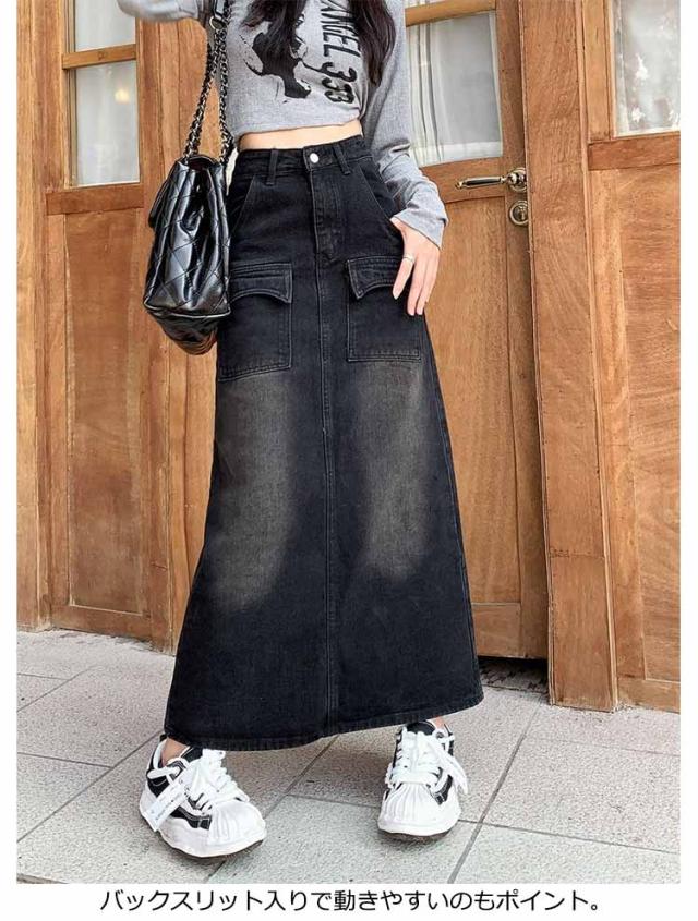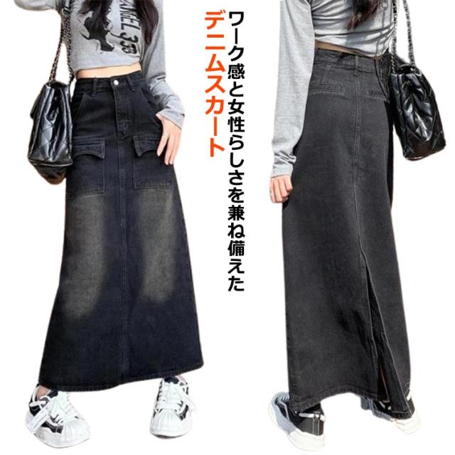 デニム カーゴスカート ロング レディース スカート ミリタリー カーゴ デニムスカート ロングスカート aライン タイト ミリタリースカート スリット タイトスカート マキシ丈 春 夏 無地 シンプル カジュアル ストリート 韓国 黒 ブラック 【送無】
