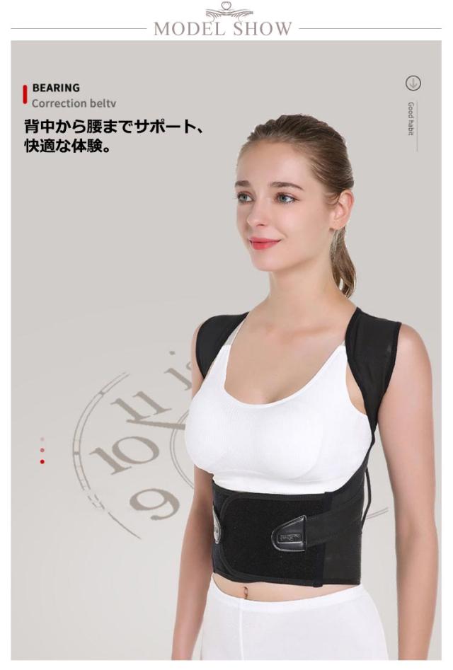 | 着るだけで美姿勢キープ 背中から腰までサポート、快適な体験。 快適な装着感、よい状態に補正できている。 装着すると、前にでていた頭と肩が後ろへ引っ張らない、美しい姿勢を記憶し、最終的にはサポーターがなくてもきれいな姿勢がキップできる事を目指します。 マジックテープ式で着脱簡単! 伸縮性・通気性抜群の生地が360度しっかりサポート! 4本のパワーズボーンで着用したまま強さを調整! お腹周りもサポート! 猫背になりがちなデスクワークや普段使いにオススメ! | |