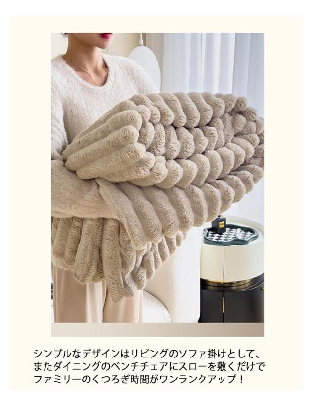 | 静電気防止フェイクラビットファーを採用!手触りでふわふわ毛布。 シンプルなデザインは和室を問わず使えます。 シンプルなデザインはリビングのソファ掛けとして、またダイニングのベンチチェアにスローを敷くだけでファミリーのくつろぎ時間がワンランクアップ! フェイクファーだけど、肌当たりがやわらかくぬくもり感じる手触りが魅力。 繊維がみっちり詰まっているので冷たい風をカットし暖かさが長続きします。 | |
