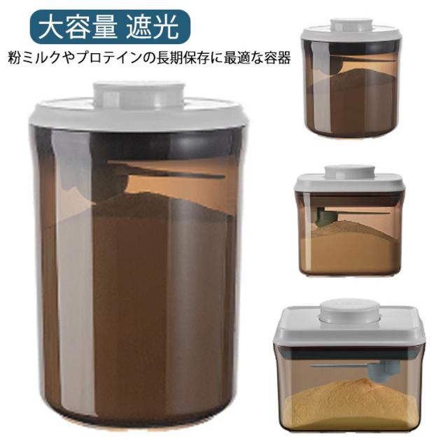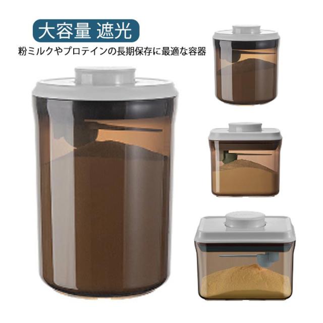 | 茶色遮光デザイン!粉ミルクやプロテインの長期保存に最適な容器 フタについているボタンを押すだけで密閉可能!片手でワンタッチなので、料理中の手がふさがっている状況でも使いやすいのがうれしいポイント。 フタ部分はスプーン収納所があり、サイズ違いスプーンにも対応できます。 コンパクトなサイズ、外遊びや旅行に大変便利なアイテムです。 粉ミルクだけでなく、米やナッツなどの保存容器としてもおすすめ。 | |