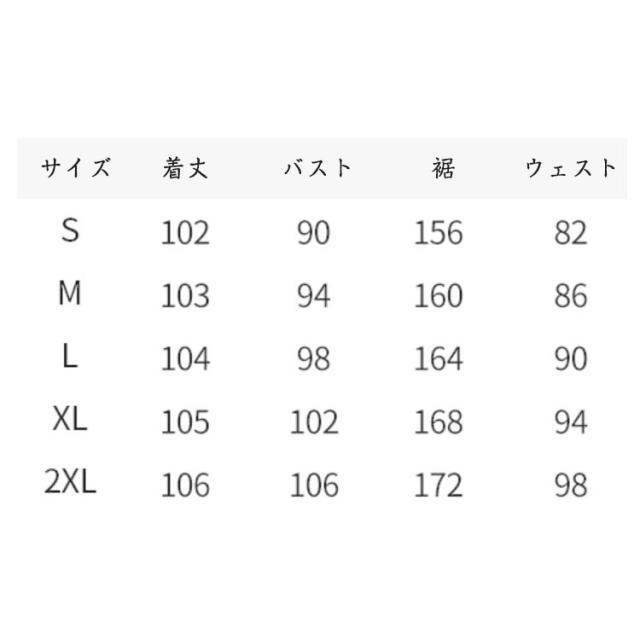 | サイズについての説明 | サイズ 着丈 バスト 裾周り ウエスト ※サイズ表の実寸法は商品によって1-3cm程度の誤差がある場合がございます。 |