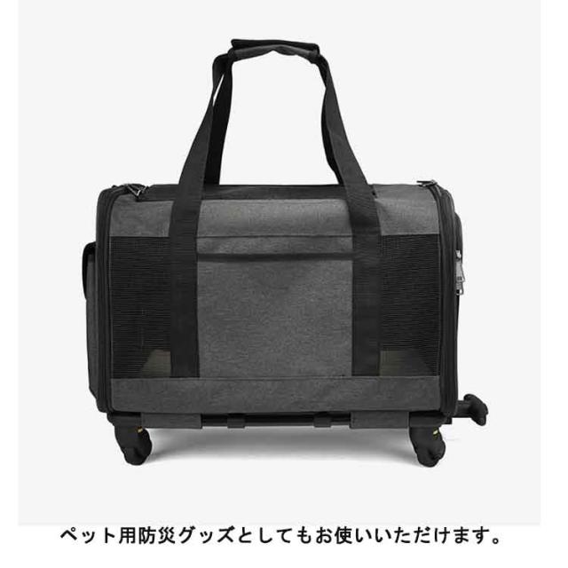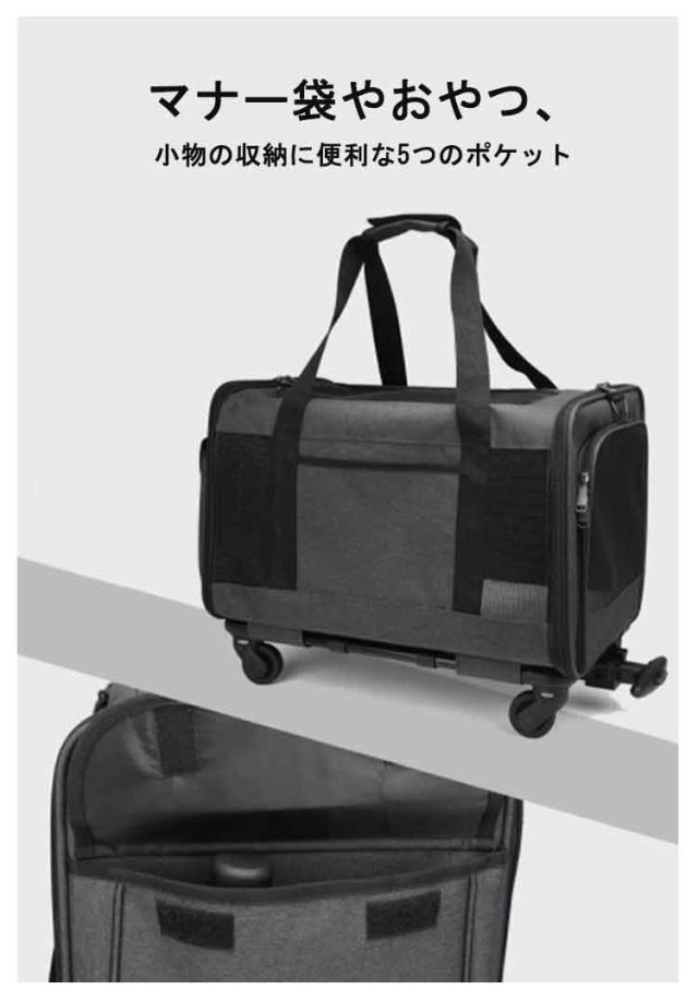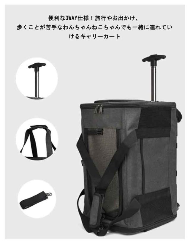 | 便利な3way仕様!旅行やお出かけ、歩くことが苦手なわんちゃんねこちゃんでも一緒に連れていけるキャリーカート トップと両サイドは通気性抜群のメッシュ素材 マナー袋やおやつ、小物の収納に便利な5つのポケット 折り畳み式のコンパクト収納設計 旅行もお出掛けもこれ1つで楽々!2WAYで使えるペットキャリーバッグ ショルダー部分は使う人やその時の状況に合わせて長さを調節できる。 ペット用防災グッズとしてもお使いいただけます。 耐久性に優れ、360度回転するキャスターを装備。楽々と転がせます。 | |