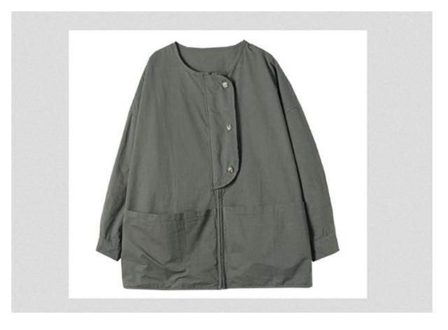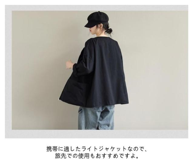 | レイヤードスタイルに最適なノーカラーライトジャケット すっきりとしたノーカラーのデザインは、レイヤードスタイルにも好相性。 フード付きのパーカーを重ねたり、スタンドカラーシャツやハイネックのTシャツを着たりと、様々なスタイリングを楽しめます。 ゆったりした身幅、長すぎない着丈は、どんなボトムともバランスよく着こなせます。 携帯に適したライトジャケットなので、旅先での使用もおすすめですよ。 | |