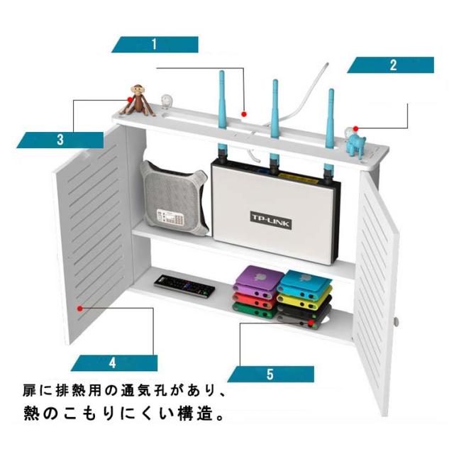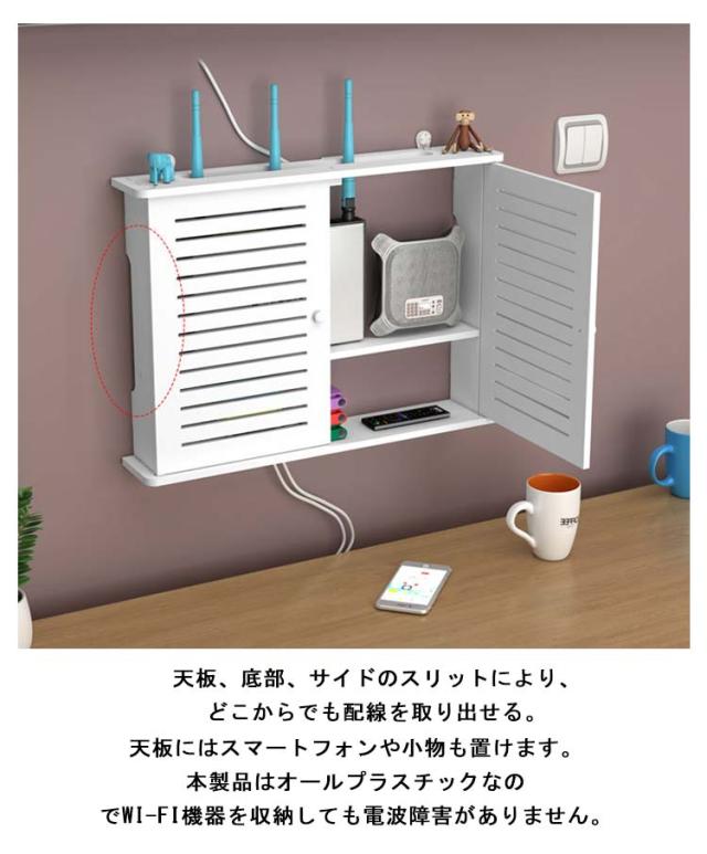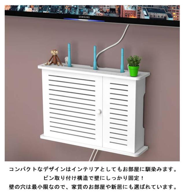 | 壁に付けられるケーブル収納ラック。ごちゃごちゃルーターやケーブル類をスッキリ隠す! ルーターやタップ・ケーブル類を裏側にまとめて収納できます。 天板にはスマートフォンや小物も置けます。 本製品はオールプラスチックなのでWi-Fi機器を収納しても電波障害がありません。 コンパクトなデザインはインテリアとしてもお部屋に馴染みます。 ピン取り付け構造で壁にしっかり固定!壁の穴は最小限なので、家賃のお部屋や新居にも選ばれています。 | |