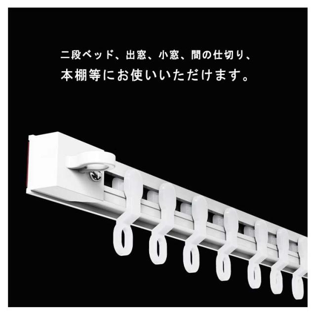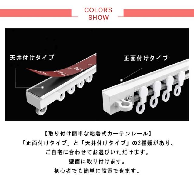 | 【取り付け簡単な粘着式カーテンレール】 「正面付けタイプ」と「天井付けタイプ」の2種類があり、ご自宅に合わせてお選びいただけます。 壁面に取り付けます。 初心者でも簡単に設置できます。 【20サイズ展開】 1.1mから3mまでの幅広いサイズ展開! 自由にカートすることもでき、お好みの長さに調節できます。 【静音性、更に開閉が快適に】 カーテンを開閉する際の音が小さいです。 開け閉めしやすく居心地のいい空間になります。 【部屋を選ばないシンプルデザイン】 シンプル、スタイリッシュデザインで、オシャレな印象を演出します。 接続部分は内蔵式なので継ぎ目が見えず、意匠性を損なわないデザインです。 二段ベッド、出窓、小窓、間の仕切り、本棚等にお使いいただけます。 | |