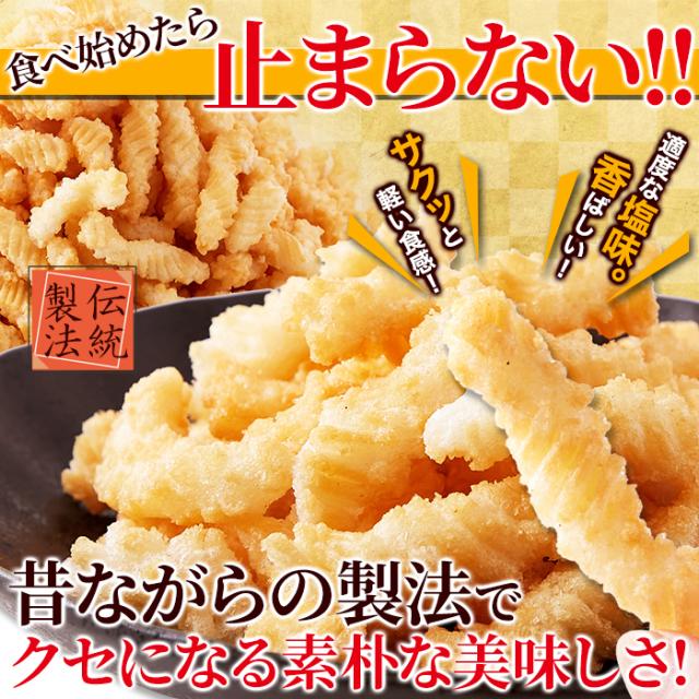 「ひねり揚げ」とは、小麦粉を使った生地をカラッと揚げて味付けしたお菓子で、「あられ」「おかき」の一種です。サクッと軽い食感と適度な塩加減がやみつきになる美味しさです。