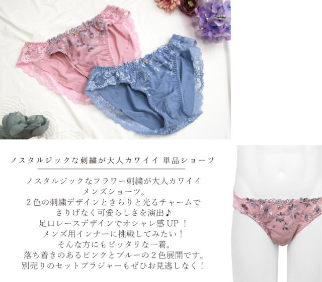 ノスタルジックなフラワー刺繍がオトナかわいいメンズショーツ。2色の刺繍デザインと、きらりと光るチャームでさりげなく可愛らしさを演出♪足口レースデザインでオシャレ感UP!メンズ用インナーに挑戦してみたい!そんな方にもピッタリな一着。落ち着きのあるピンクとブルーの2色展開です。別売りのセットブラジャーもぜひお見逃しなく!