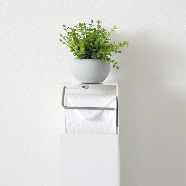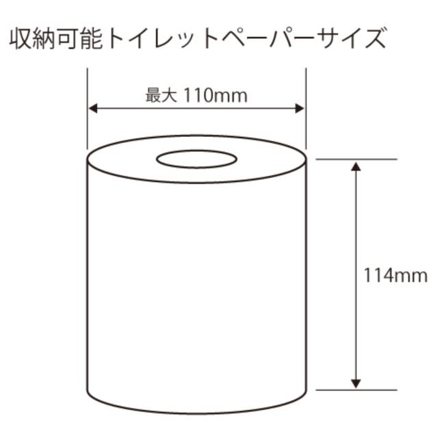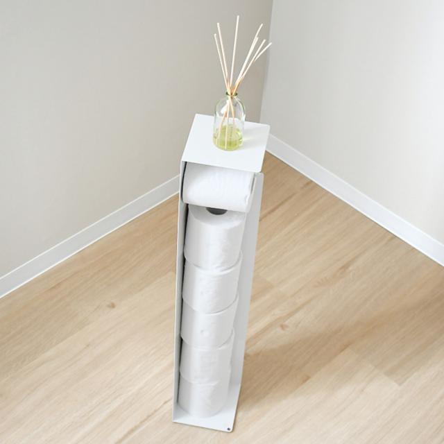 表から見るとペーパーホルダー、背面は便利な収納スペースになった置き型ペーパーホルダーです。ホワイトのカラーとシンプルなデザインがトイレ内にスッキリとした清潔感ある印象を与えてくれます。トイレットペーパーは最大5ロール収納可能です。