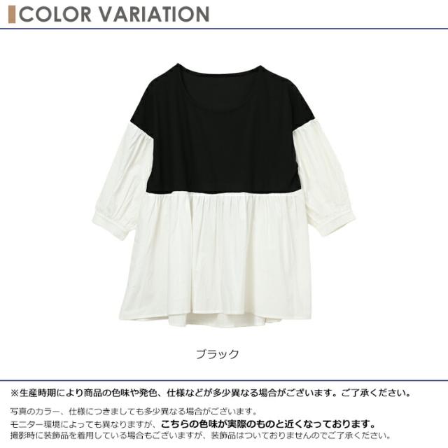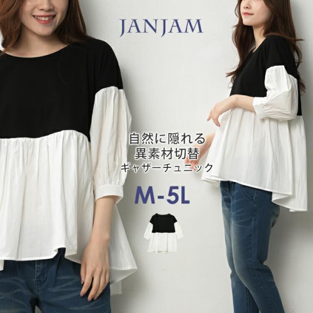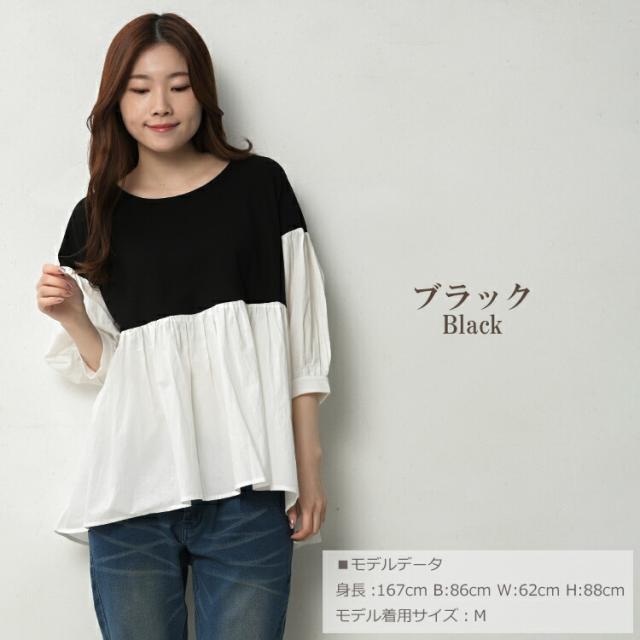 大きいサイズ レディース 異素材切り替えチュニック 7分袖 メール便送料無料 ボリューム袖 Uネック トップス M/LL/3L/4L/5L ゆったりサイズ ぽっちゃり女子 プラスサイズ