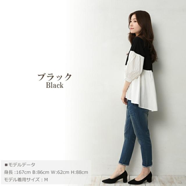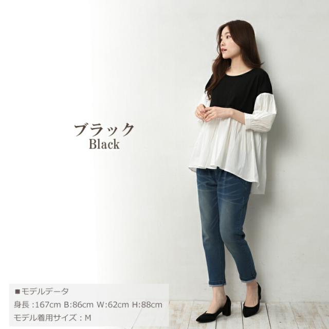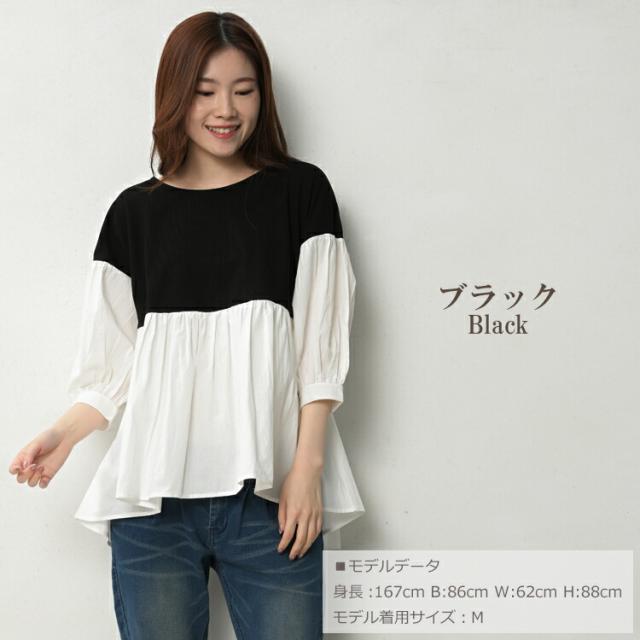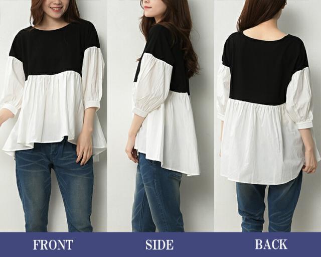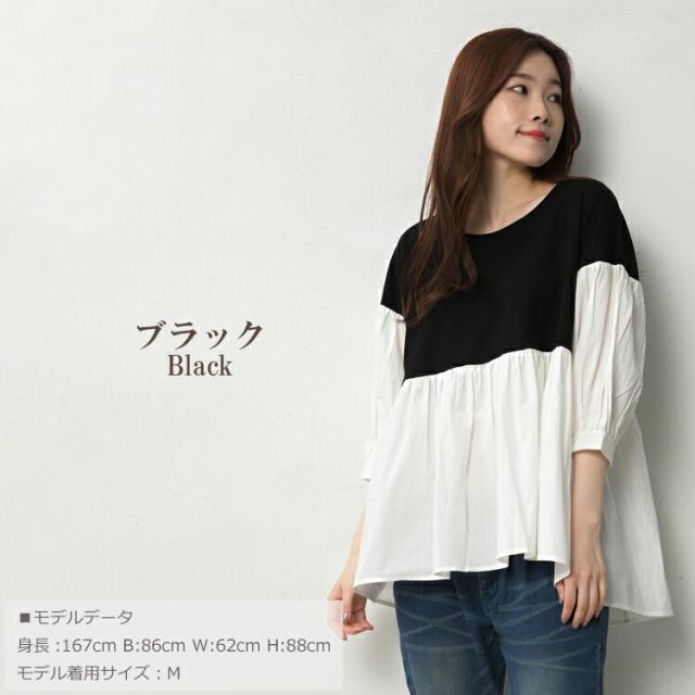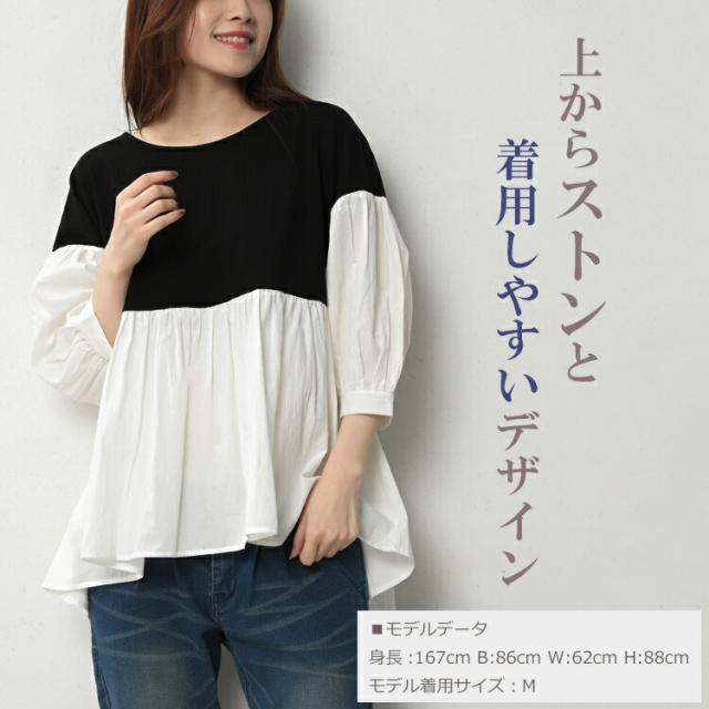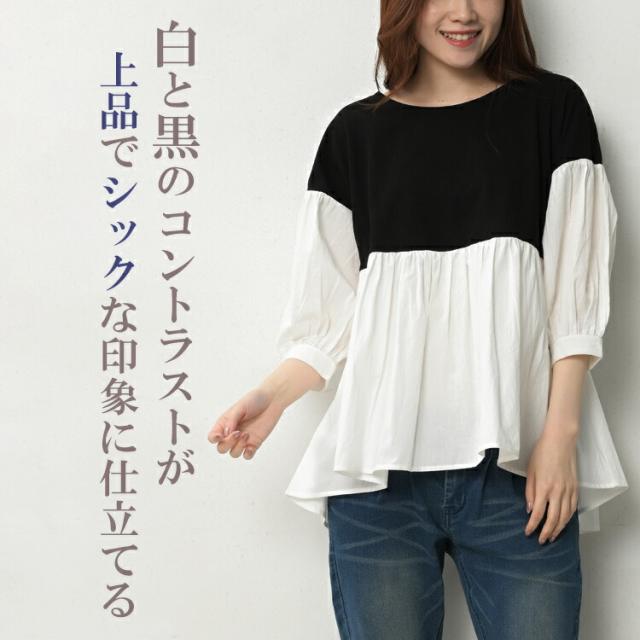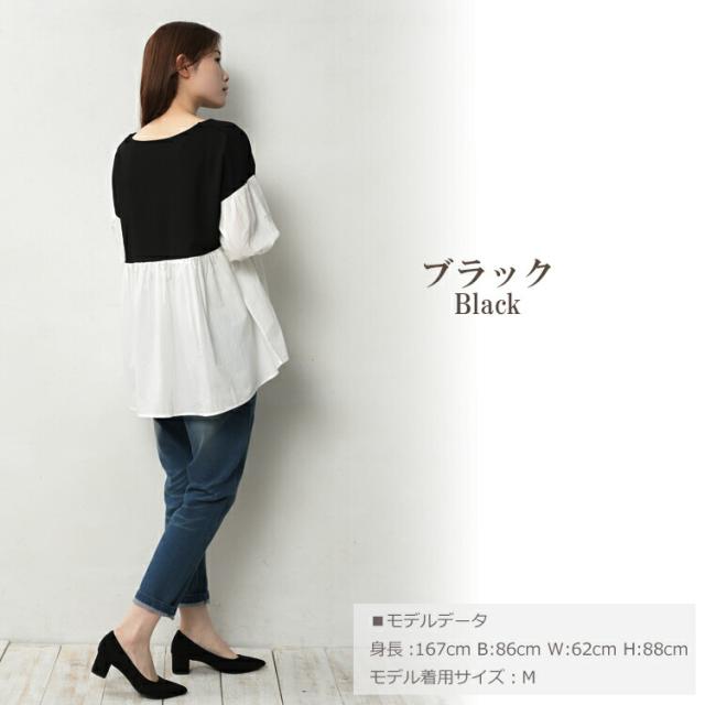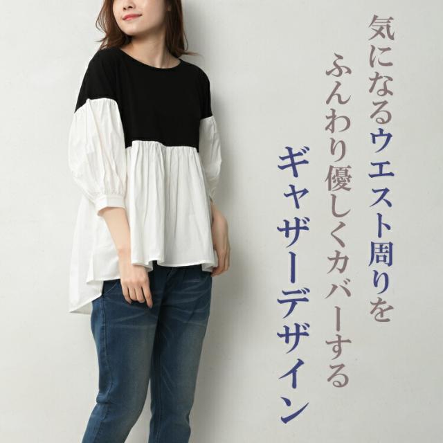 ぽっこりお腹も自然に隠す異素材切替チュニック。 気になるウエスト周りをふんわり優しく カバーするギャザーデザイン。 白と黒のコントラストが上品で シックな印象に仕立てるトップスです。 |