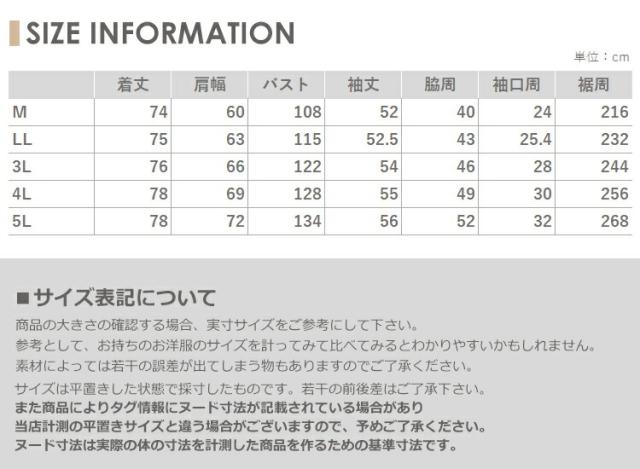5L:着丈78 肩幅72 バスト134 袖丈56 脇周52 袖口周32 裾周268