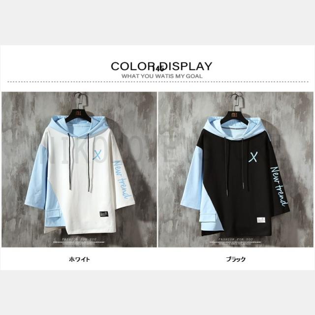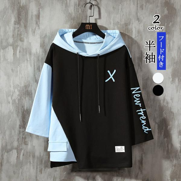 \2点購入で10%OFF!/パーカー メンズ フード付き 半袖 半袖パーカー プルオーバ シンプル 小さいサイズ 大きいサイズ レイヤード 七分袖 男の子 薄手