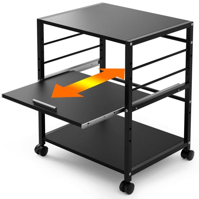 ??【中棚板スライド式&棚板高さ調節可能】プリンター台の中棚板はスライド式で、取っ手も付きで自由に出し入れできます。上棚板と中棚板の高さは3段階調整できて、収納物に合わせて組立できて便利です。