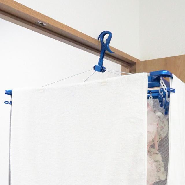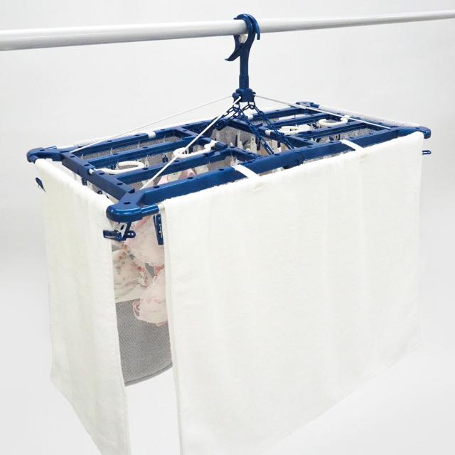 周囲にタオルが干せるピンチハンガーです。内側に見られたくない洗濯物を干して、タオルで目隠しをすることができます。52個のピンチ付きで洗濯物をたくさん干すことができます。