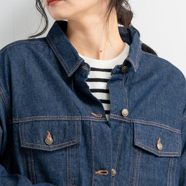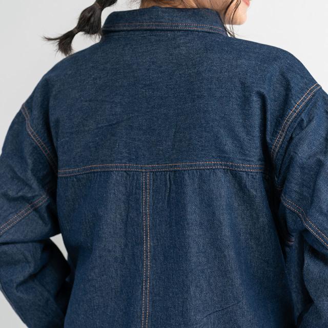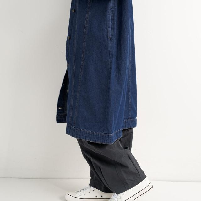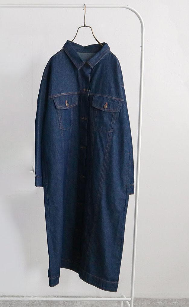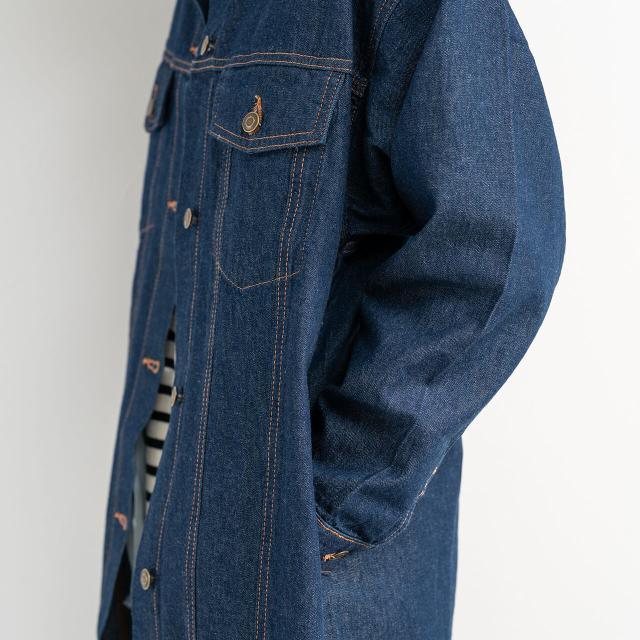 少し厚手の8ozデニムを使用したロングGジャン。細かなステッチワークで一枚でも映えるアイテムに。レイヤードスタイルなどにもおすすめです。前開きにすれば羽織りとしても活躍するアイテムです