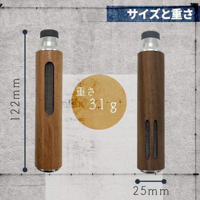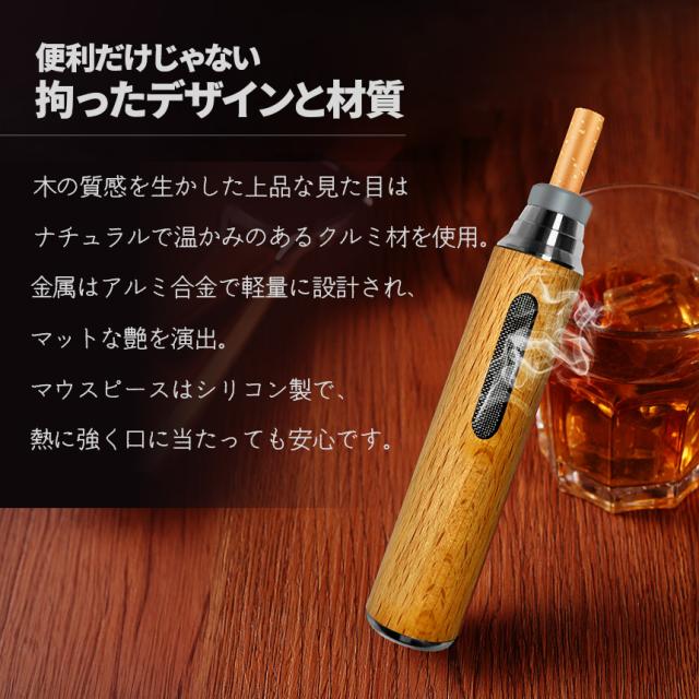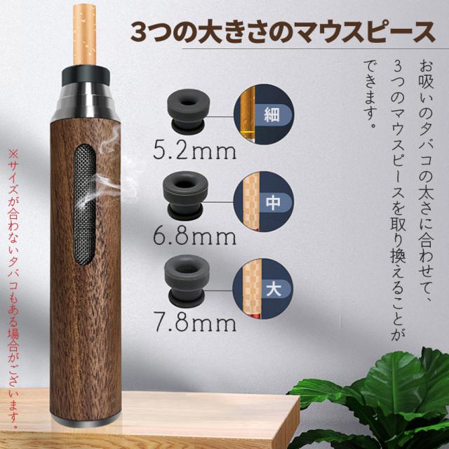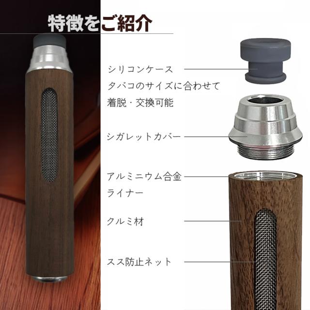 本体は高品質のくるみ木材採用。木の風合いもよくお洒落なデザイン性です。ナチュラルとブラウンの2つの色合いからお選びいただけます。軽量な設計ですので、重くて吸いにくいといったことはありません。3種のシリコンホルダーもセットになっていて、いろいろなサイズのたばこに適応出ます。