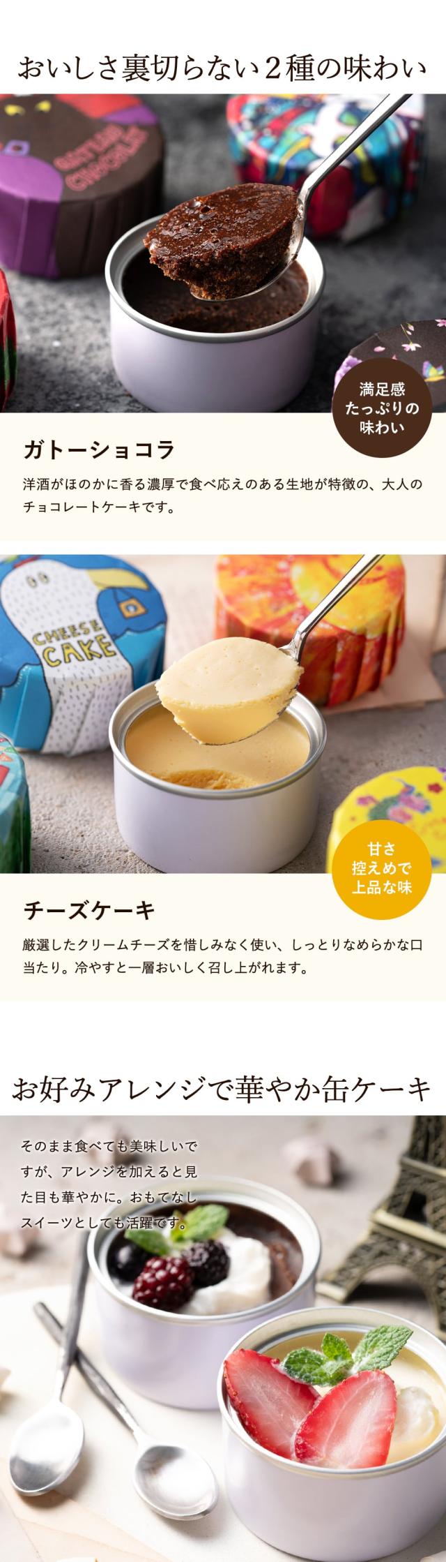 有名菓子店で修業し たパティシエが、缶詰なのに本格的な口当たりのケーキのクオリティに仕上げました。 ガトーショコラ と チーズケーキ の2種類から選べる、新感覚スイーツです。