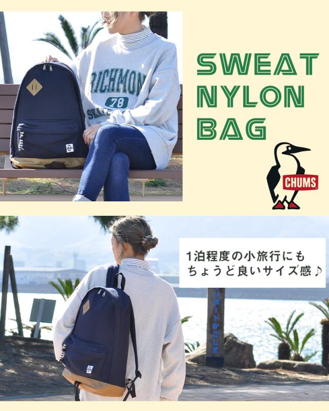カジュアルな雰囲気のスウェットをメインに、負荷が多くかかる箇所には機能性の高いナイロンを合わせたCHUMS定番のバッグシリーズ。