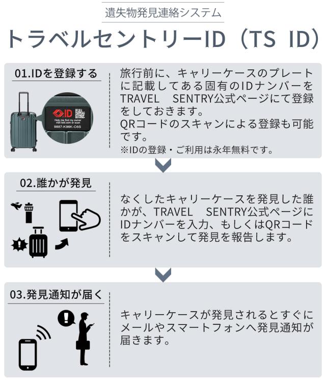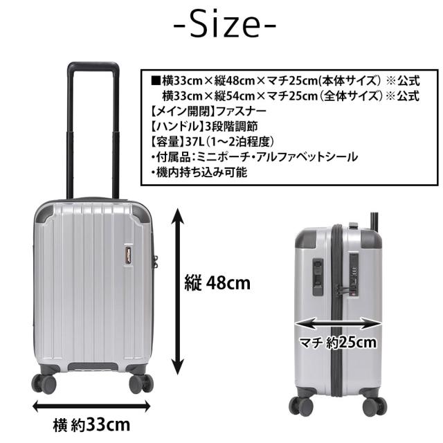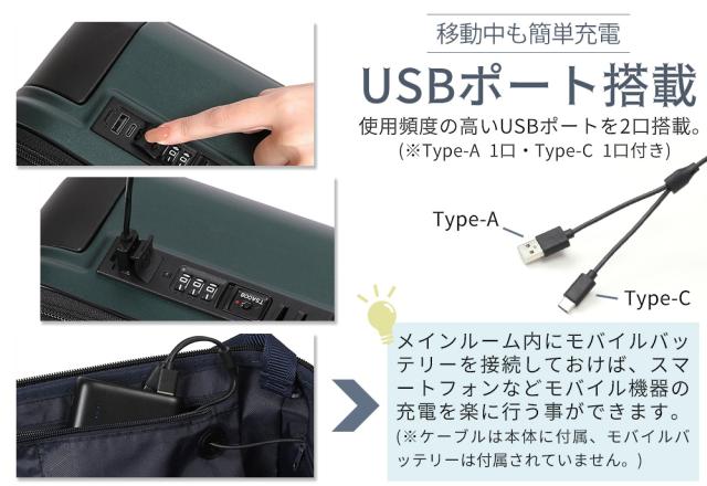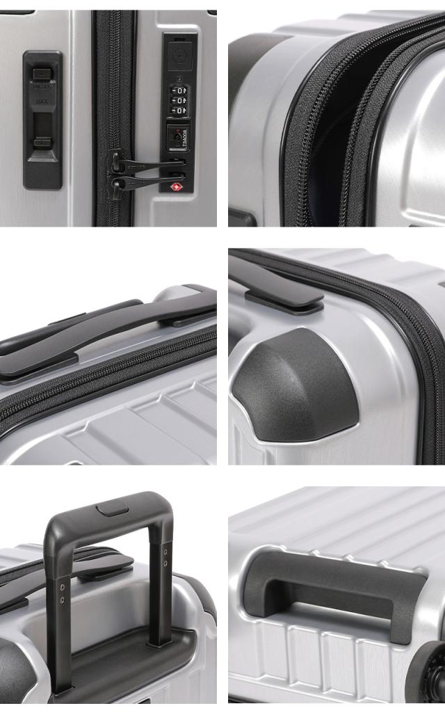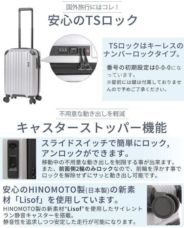 | 備考 | 【メイン開閉】ダブルファスナー 内側/ ファスナー仕切り クロスベルト ファスナーポケット×3(2つはメッシュタイプ) 付属/ ・ミニポーチ ・アルファベットシール ■特徴 ・TSロック装備(キーレスナンバーロックタイプ) ・USBポート(Type-A 1口・Type-C 1口付き) ・HINOMOTO製ストッパー付き静音キャスター(SILENT RUN) ・伸縮ハンドル(3段階調節) ・トラベルセントリーID付属 キーワード: 保証付き メンズ レディース シンプル 男性 女性 ビジネス 出張 旅行 軽量 ファスナータイプ ブラック ネイビー シルバー グリーン 緑色 黒色 紺色 1泊 2泊 100席以上 機内持ち込み 可能 小型 シンプル USBポート TSロック 静音 4輪 学生 ブランド ポイント消化 ニューバッグワカマツ | ||