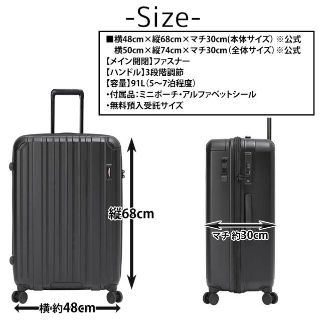 | サイズ(約) ※当店実寸値 | 公式サイズ 横48cm×縦68cm×マチ30cm (本体サイズ) 公式サイズ 横50cm×縦74cm×マチ30cm (全体サイズ) 【3辺合計】154cm 【キャリーバー】3段階調節 【容量】91L | ||