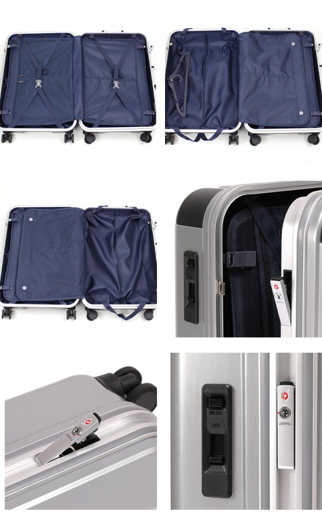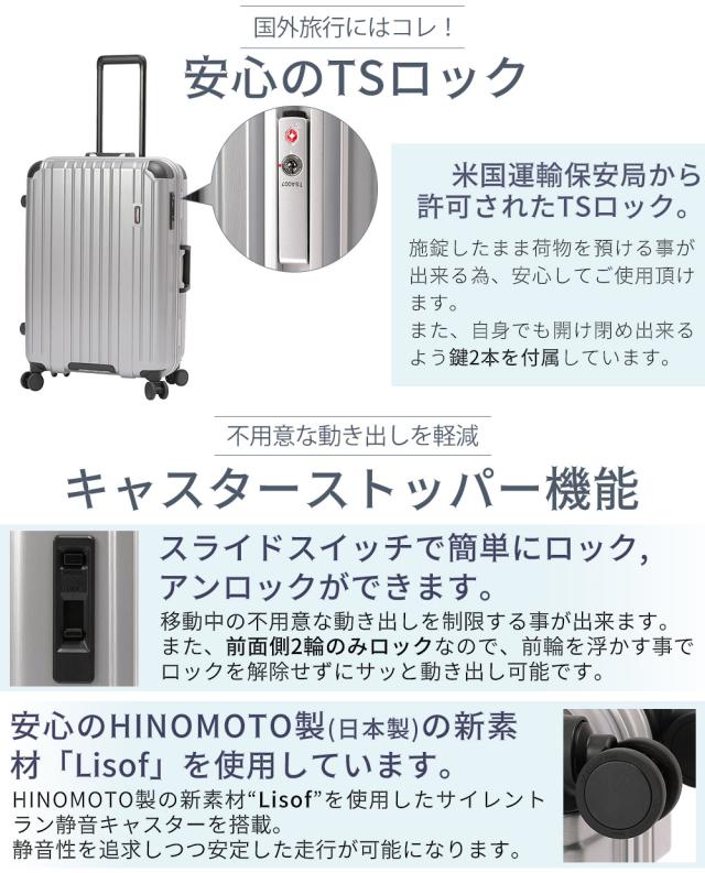 キーワード: 保証付き シンプル 男性 女性 ビジネス 出張 旅行 軽量 フレームタイプ ブラック ネイビー シルバー 黒色 紺色 5泊 6泊 7泊 無料手荷物サイズ 大型 シンプル TSロック 静音 4輪 学生 ブランド