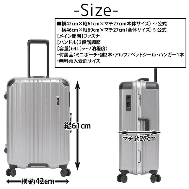 | 備考 | 【メイン開閉】フレーム 内側/ フック式ディバイダー×2(1つはファスナーメッシュポケット×2) クロスベルト×2 付属/ ・ミニポーチ ・鍵2本 ・アルファベットシール ・ハンガー1本 ■特徴 ・TSロック装備 ・HINOMOTO製ストッパー付き静音キャスター(SILENT RUN) ・伸縮ハンドル(3段階調節) ・トラベルセントリーID付属 キーワード: 保証付き メンズ レディース シンプル 男性 女性 ビジネス 出張 旅行 軽量 フレームタイプ ブラック ネイビー シルバー 黒色 紺色 5泊 6泊 7泊 無料手荷物サイズ 大型 シンプル TSロック 静音 4輪 学生 ブランド ポイント消化 ニューバッグワカマツ | ||