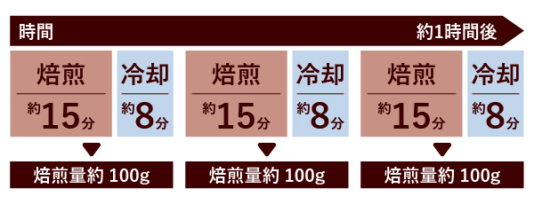 焙煎後はすぐに豆を取り出せるので、連続して焙煎することができます。約1時間後に約300g(焙煎後質量)焙煎が可能です。