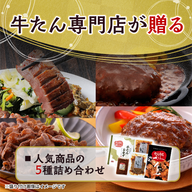 ・看板商品の厚切り牛たんをはじめ、牛たんハンバーグ、南蛮味噌漬など5種セットです。