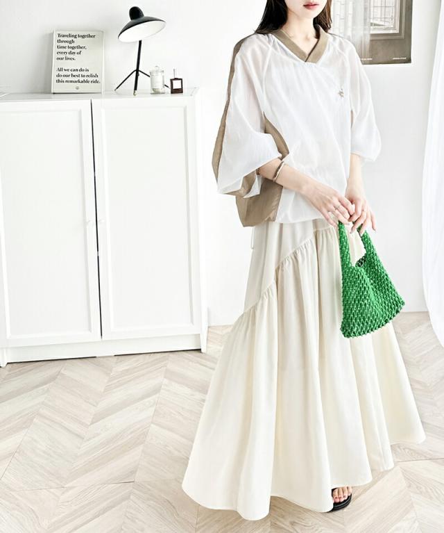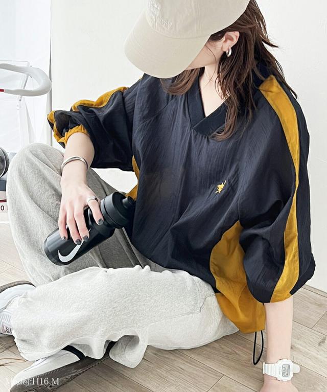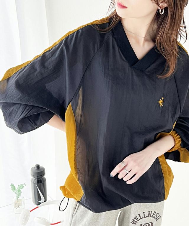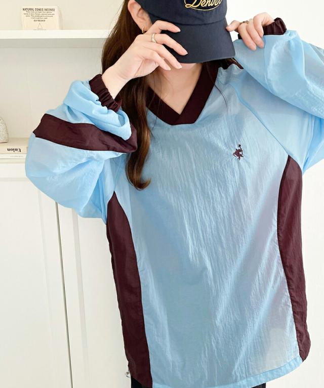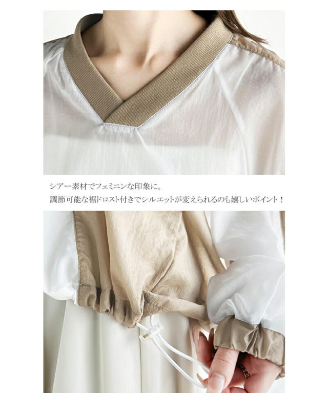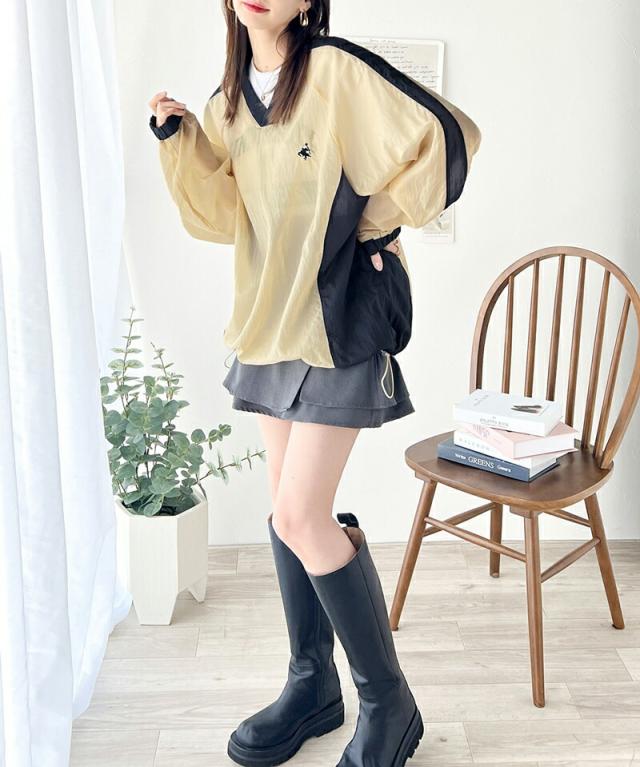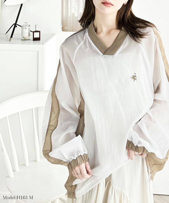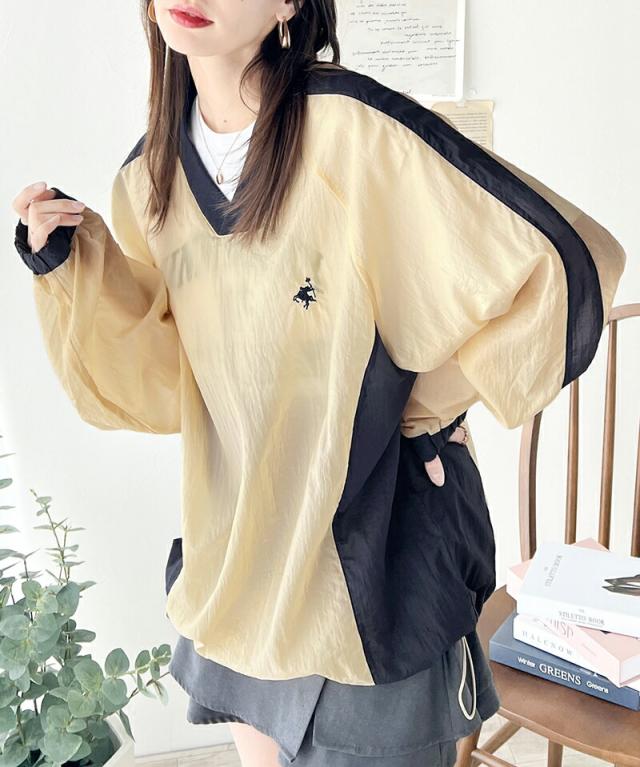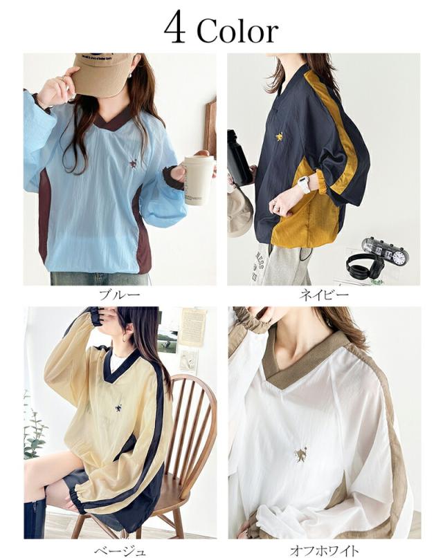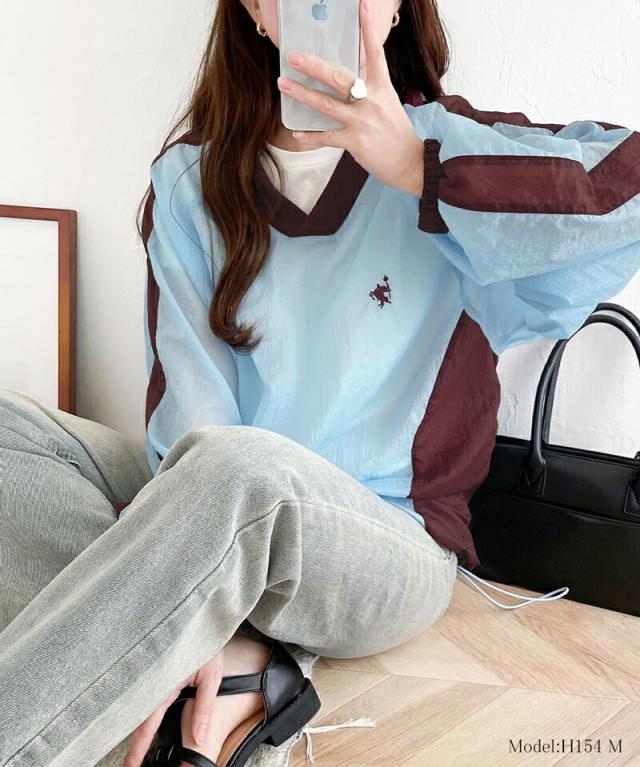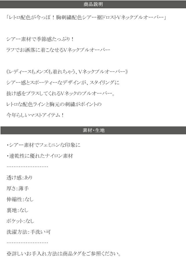 ★レトロ配色が今っぽ!胸刺繍配色シアー裾ドロストVネックプルオーバー★