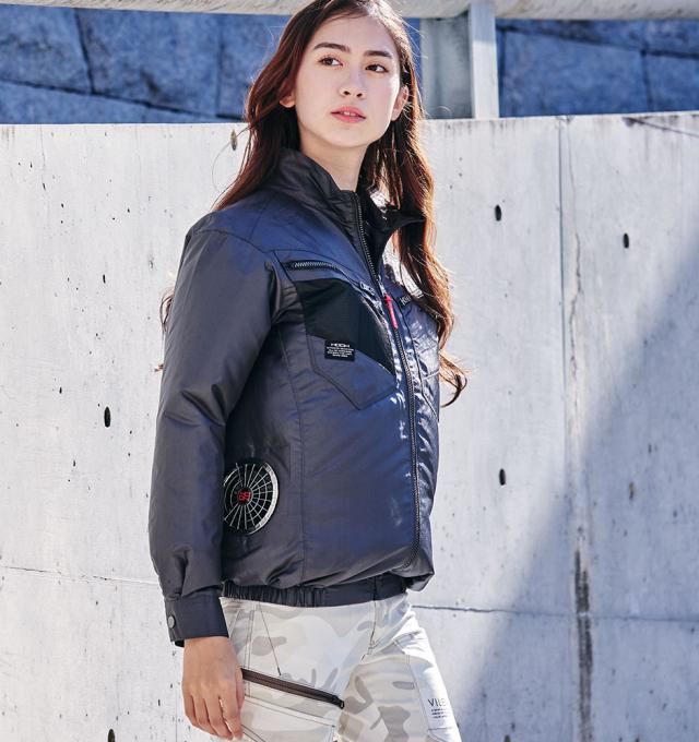 ファスナー付き右胸ポケット(飾りメッシュ)、ファスナー付き左胸ポケット(ペン差し)、ロゴ入りフロントファスナー&HOOH引手、ファスナー付きバッテリーポケット、ケーブル止めマジックテープ、首回り風抜け仕様、左袖ペン差し